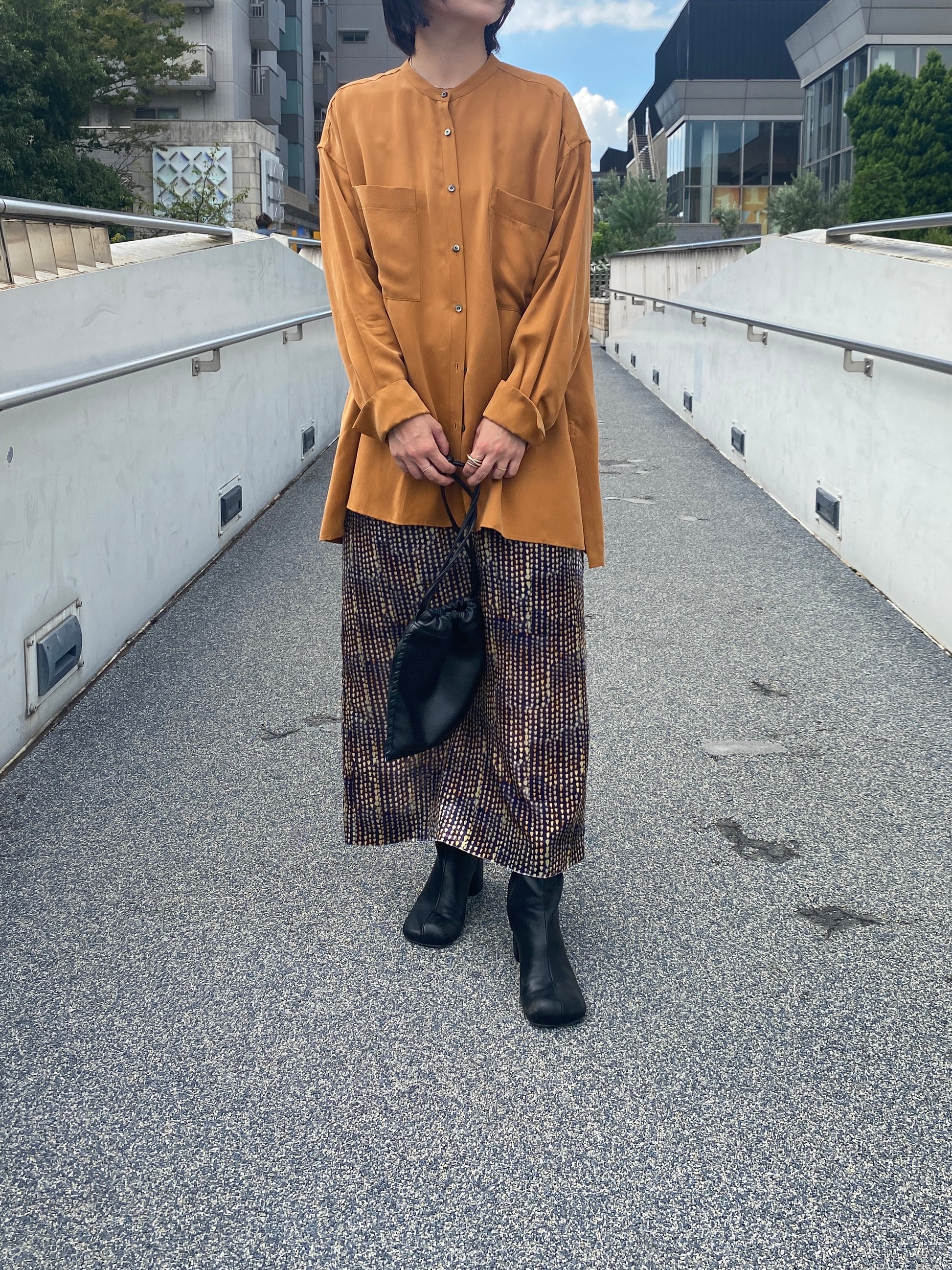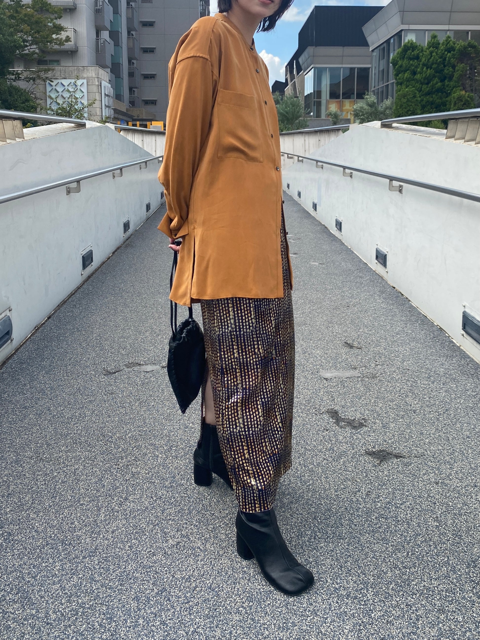 ドット部分の凹凸が光を受けて表情を変え、シンプルなトップスと合わせても印象的なスタイリングに。