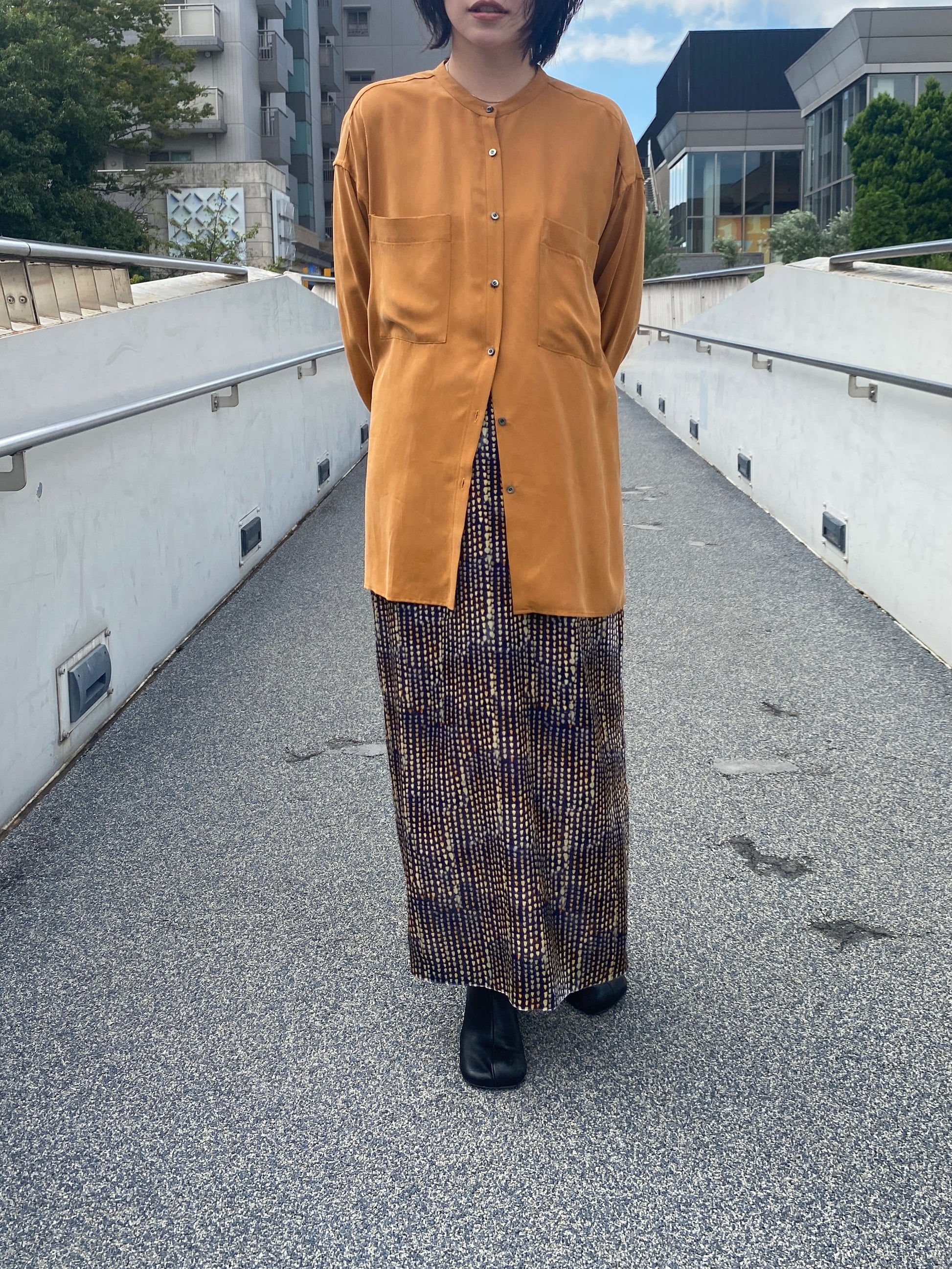 シンプルなシルエットながら、素材の存在感でコーディネートに奥行きを与えてくれる一着です。