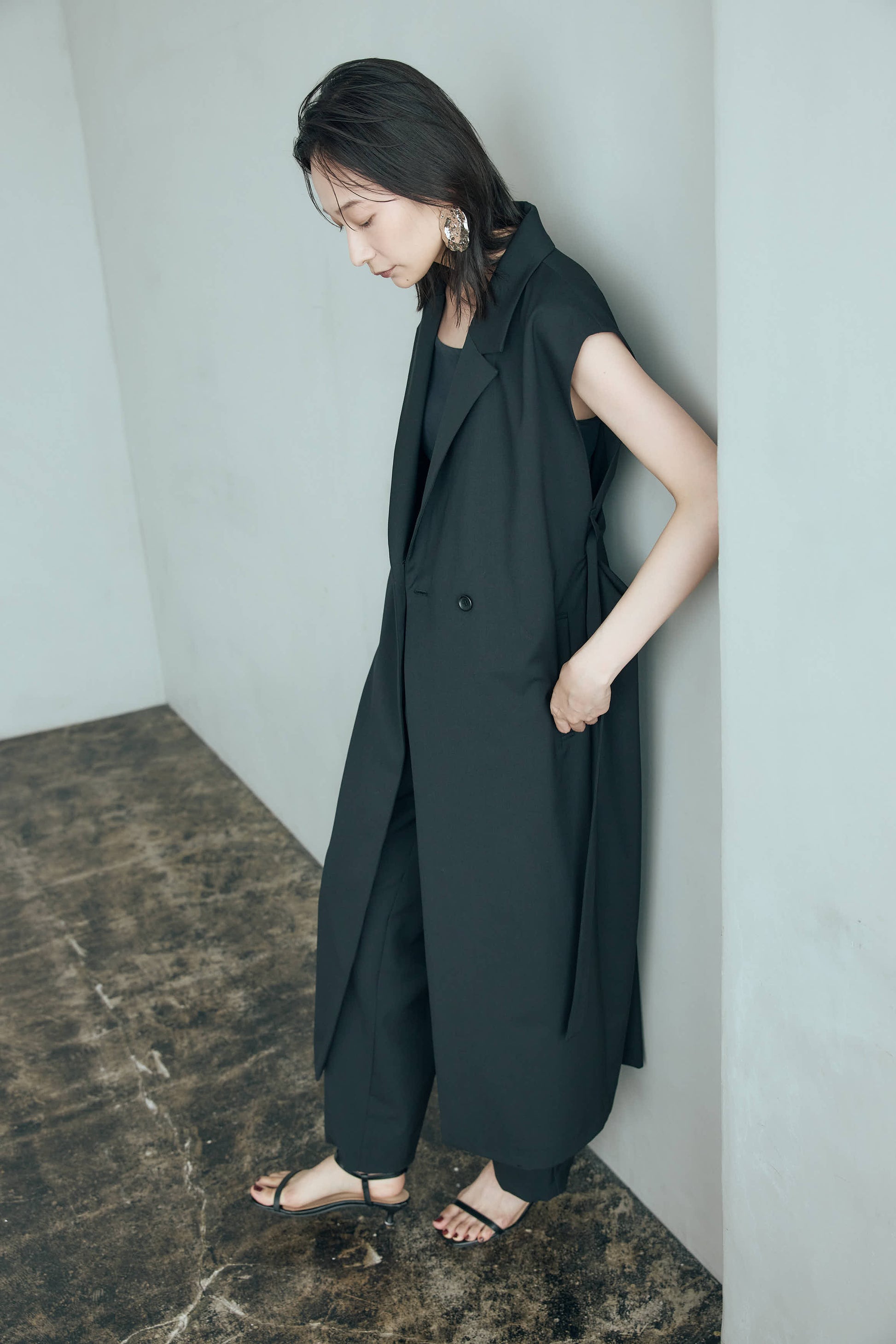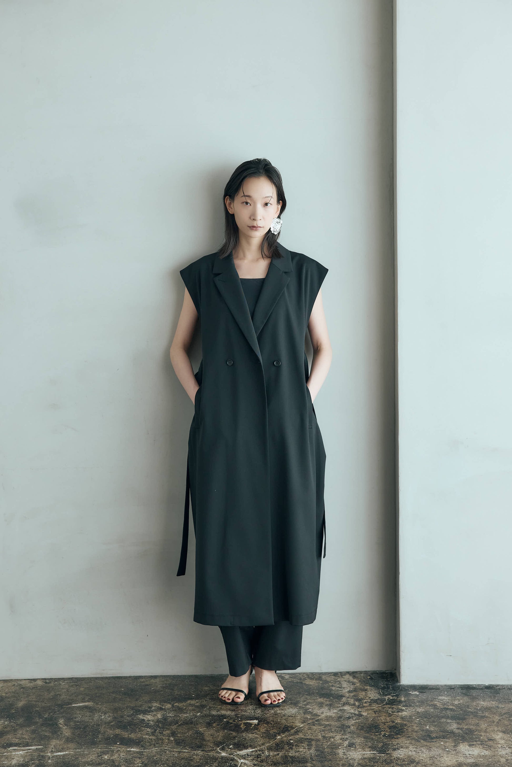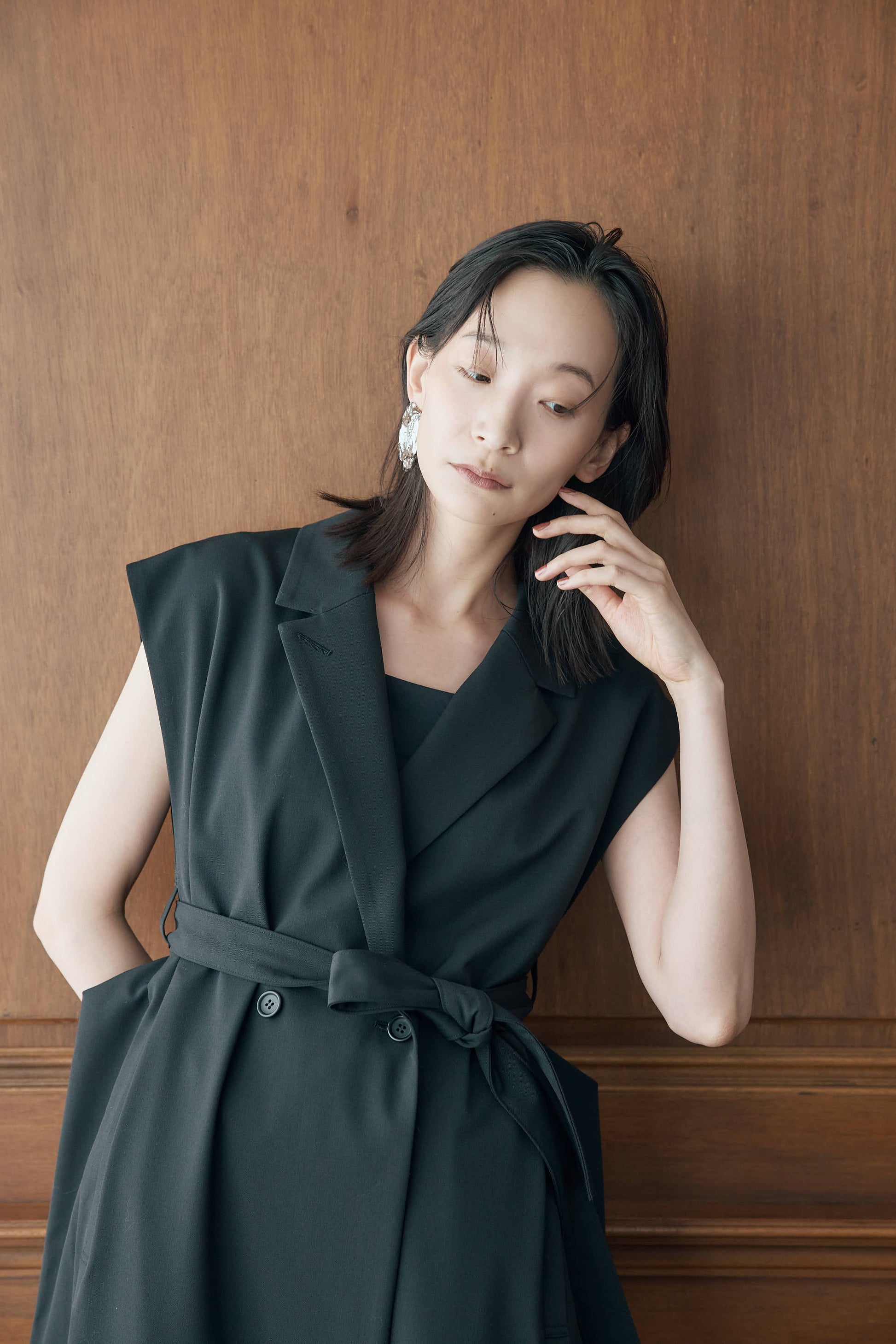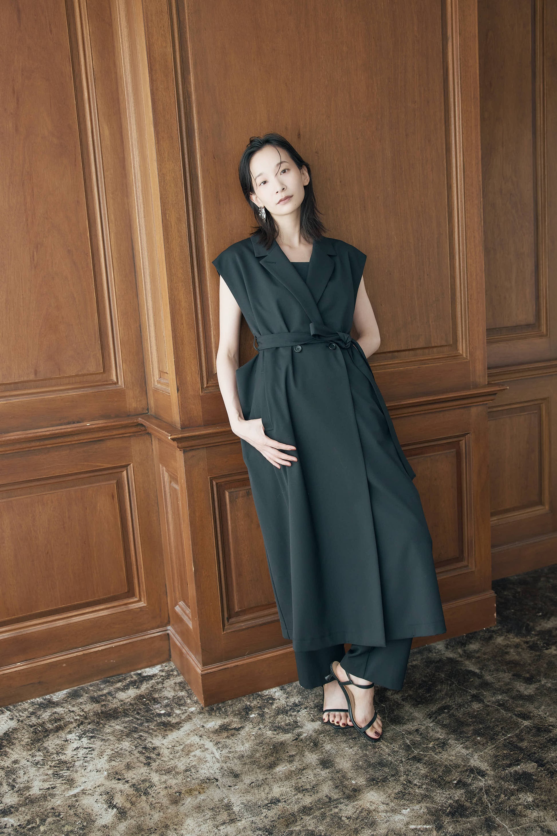 ベルト付きジレはウエストを引き締め、洗練されたバランスを生み出してくれます。