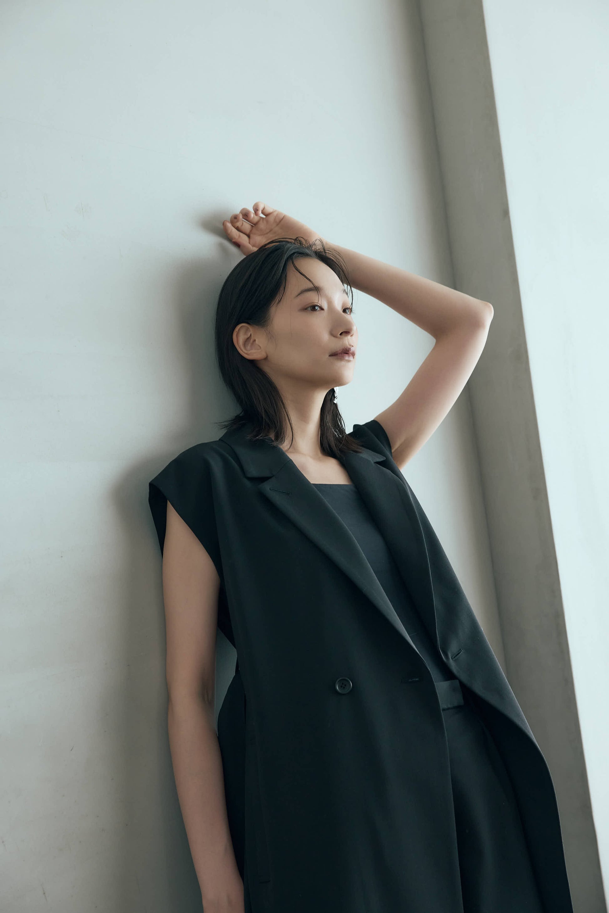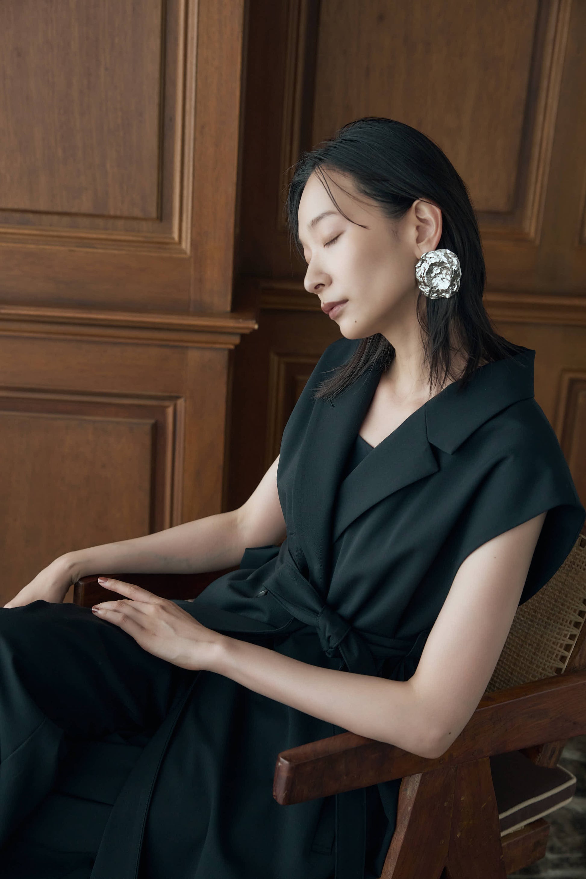 黒のタートルニットやシンプルなシアーインナーと合わせるとシンプルながらも構築的なスタイリングが完成します