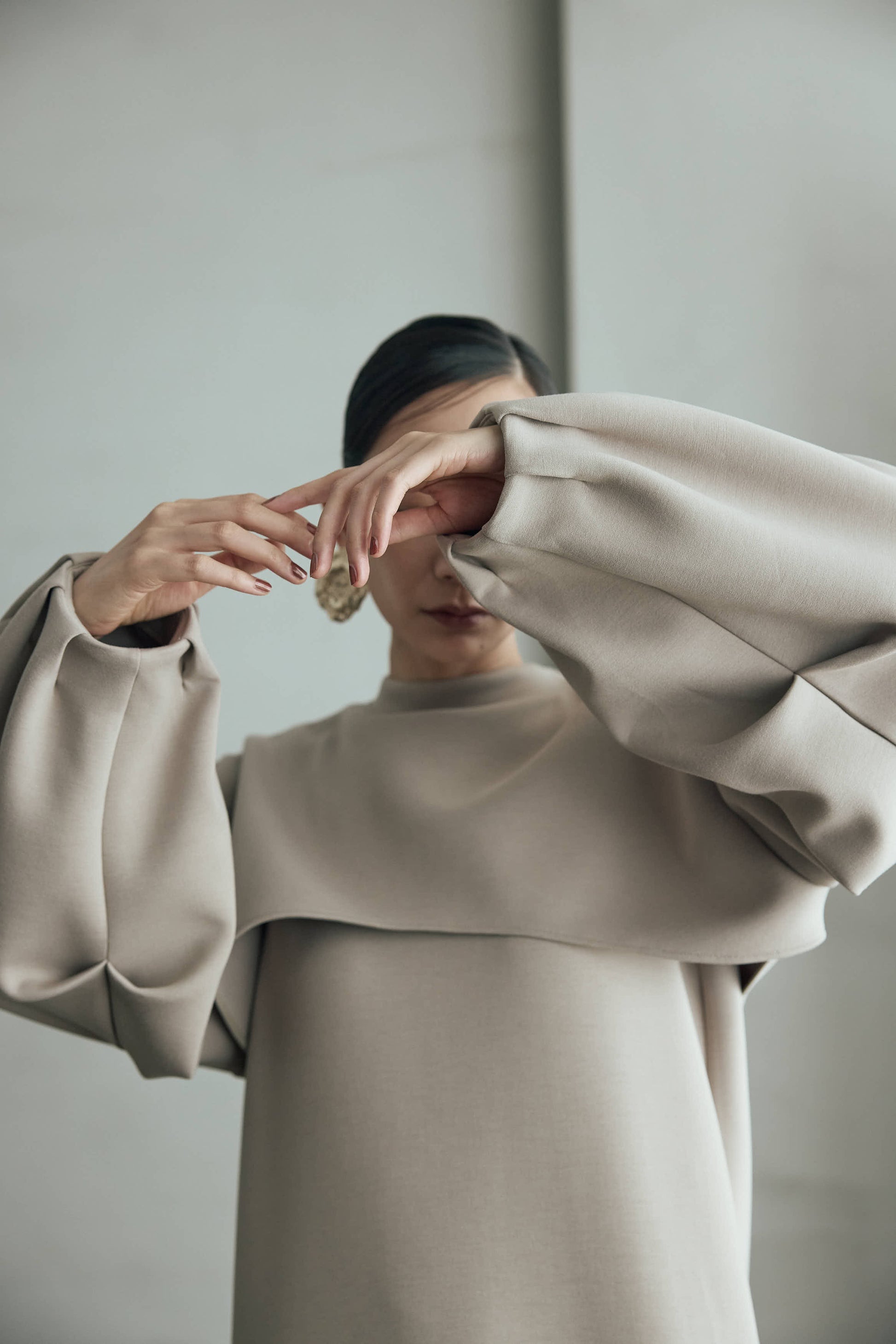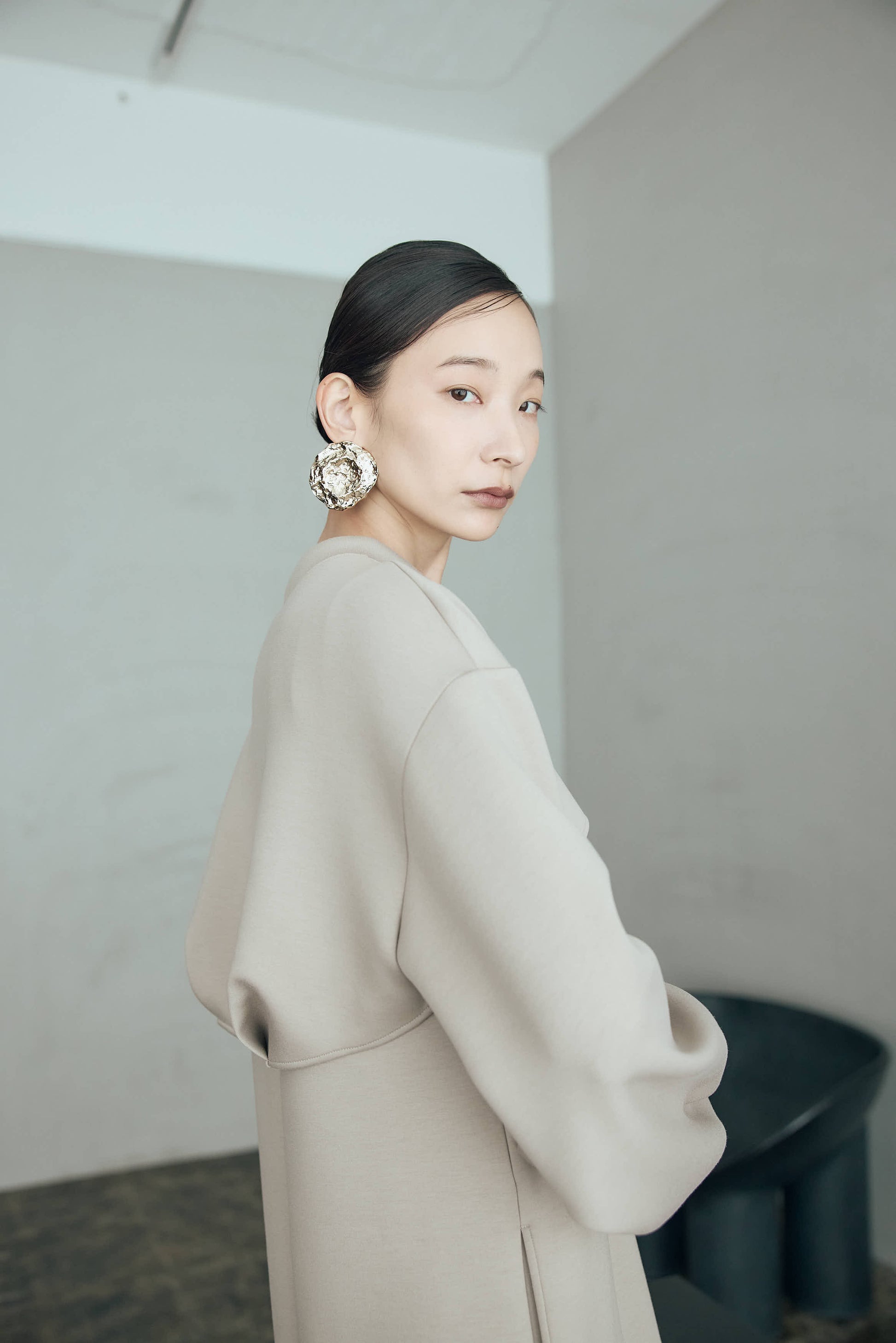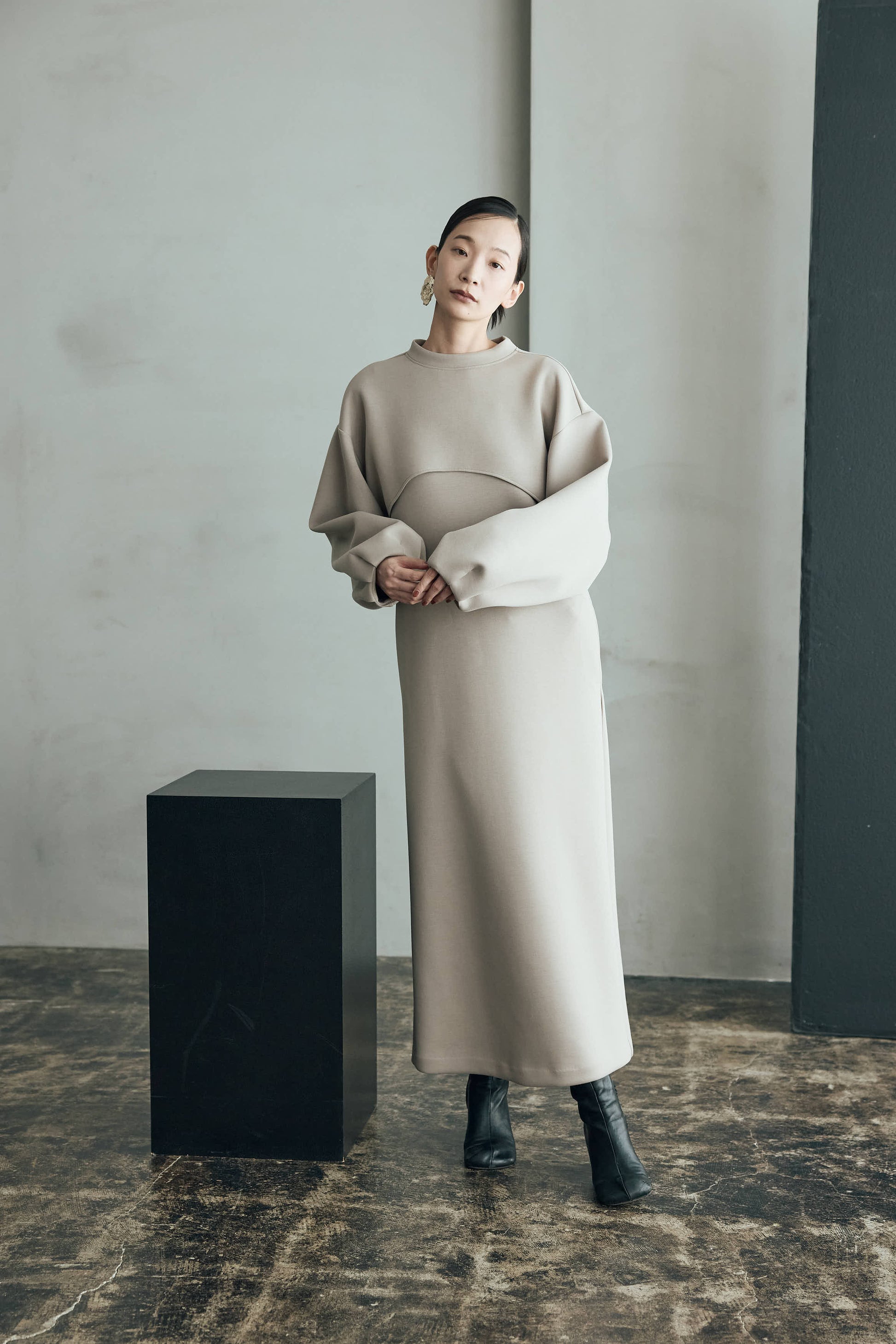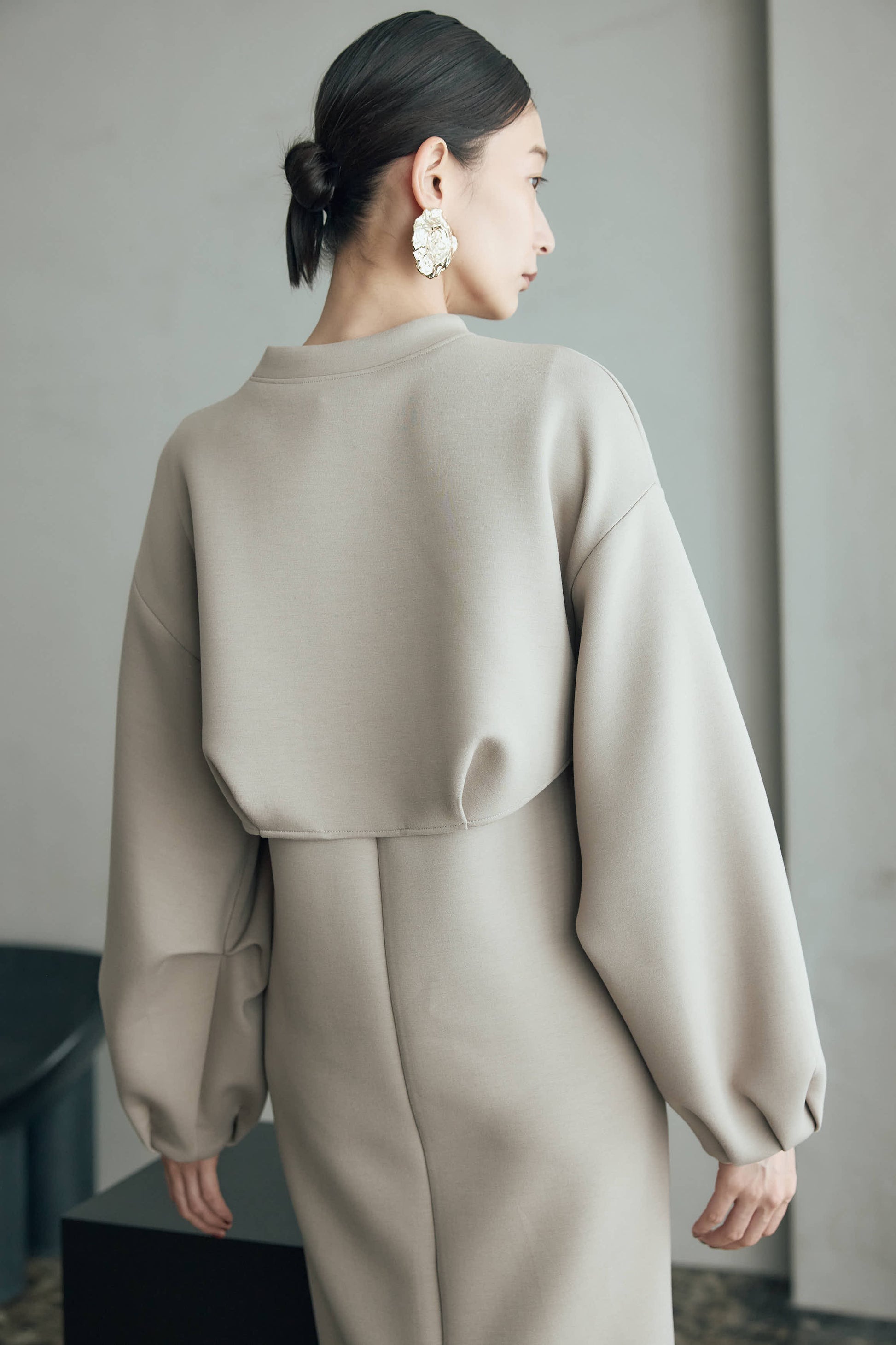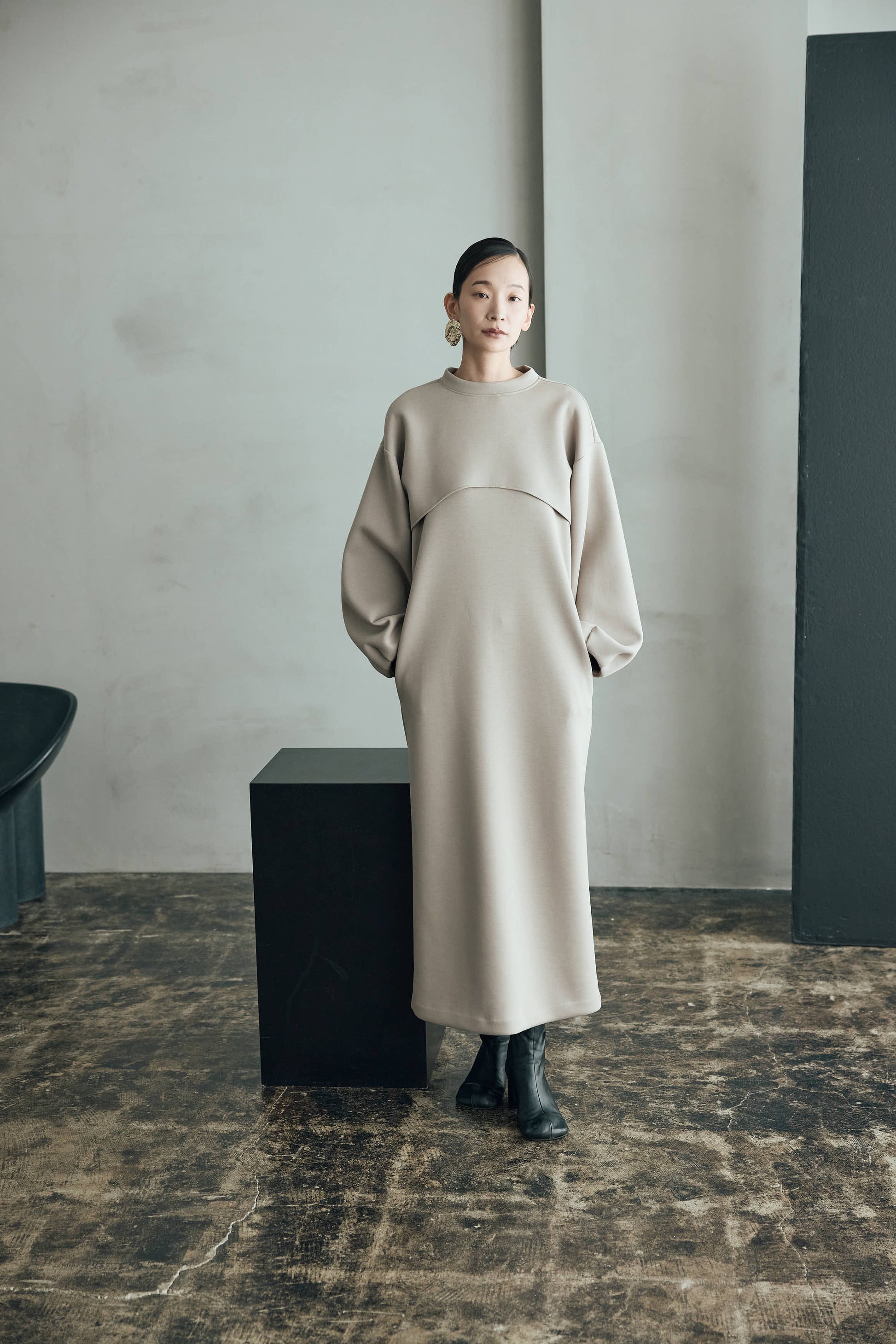 シンプルなワンピースに丸みのあるスリーブが印象的なプルオーバーを重ねることで奥行きのあるスタイリングを楽しめます。