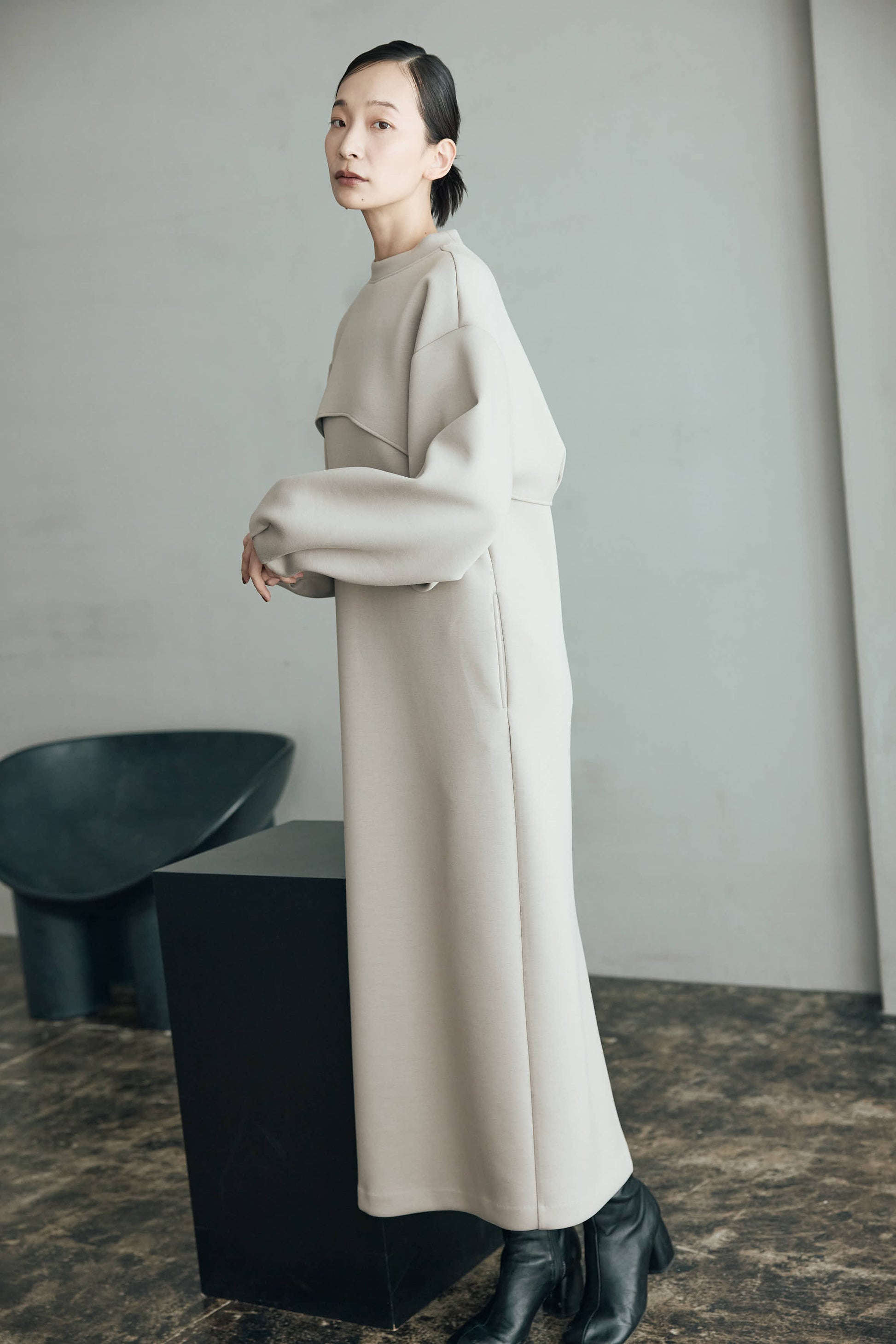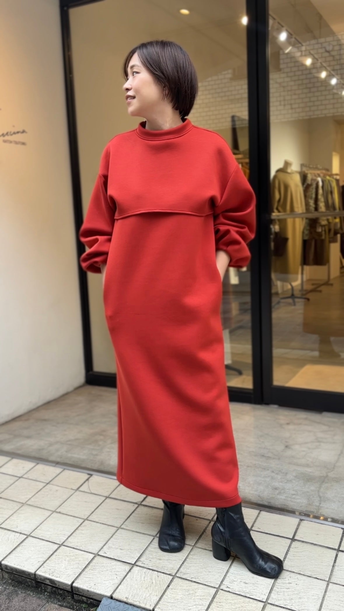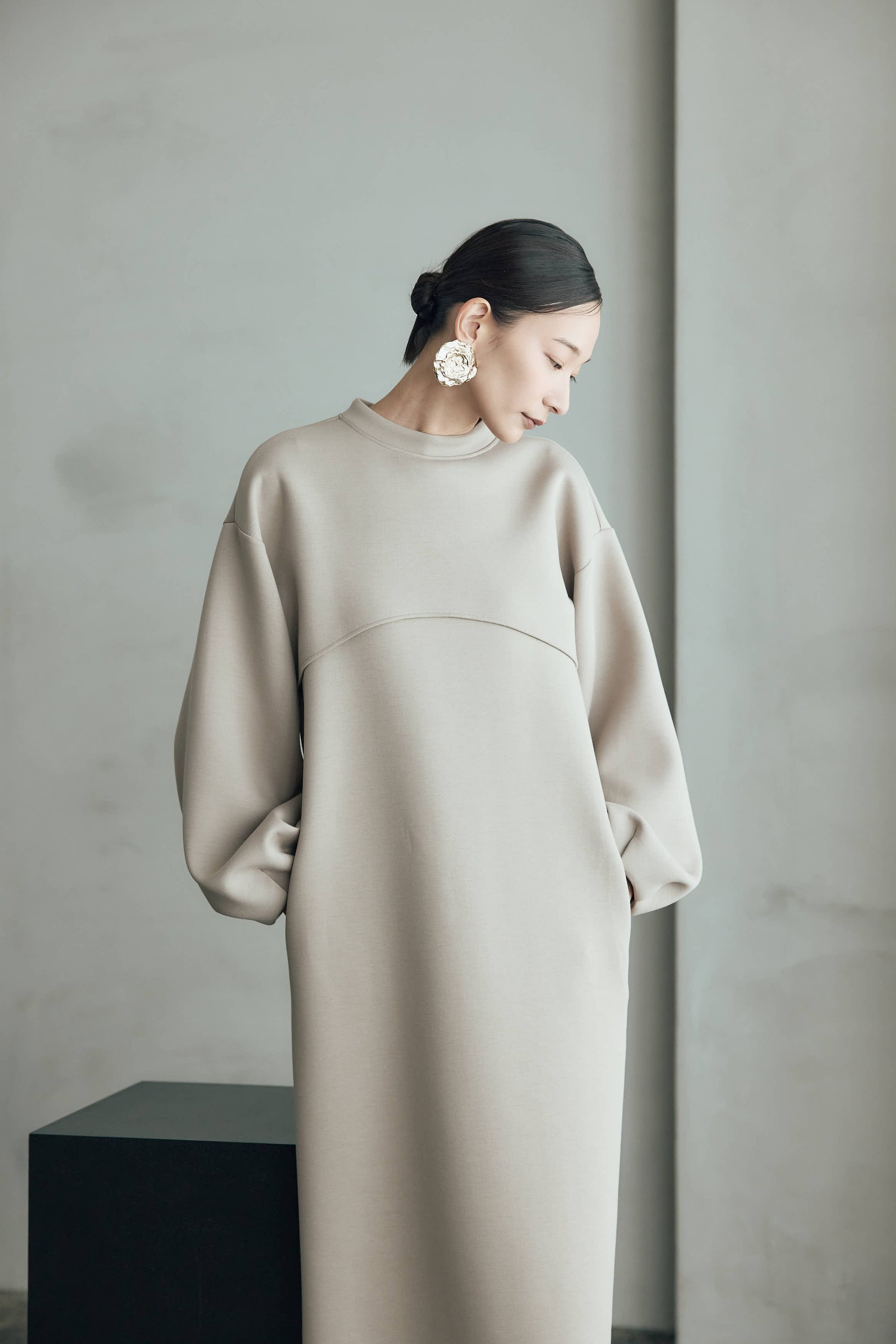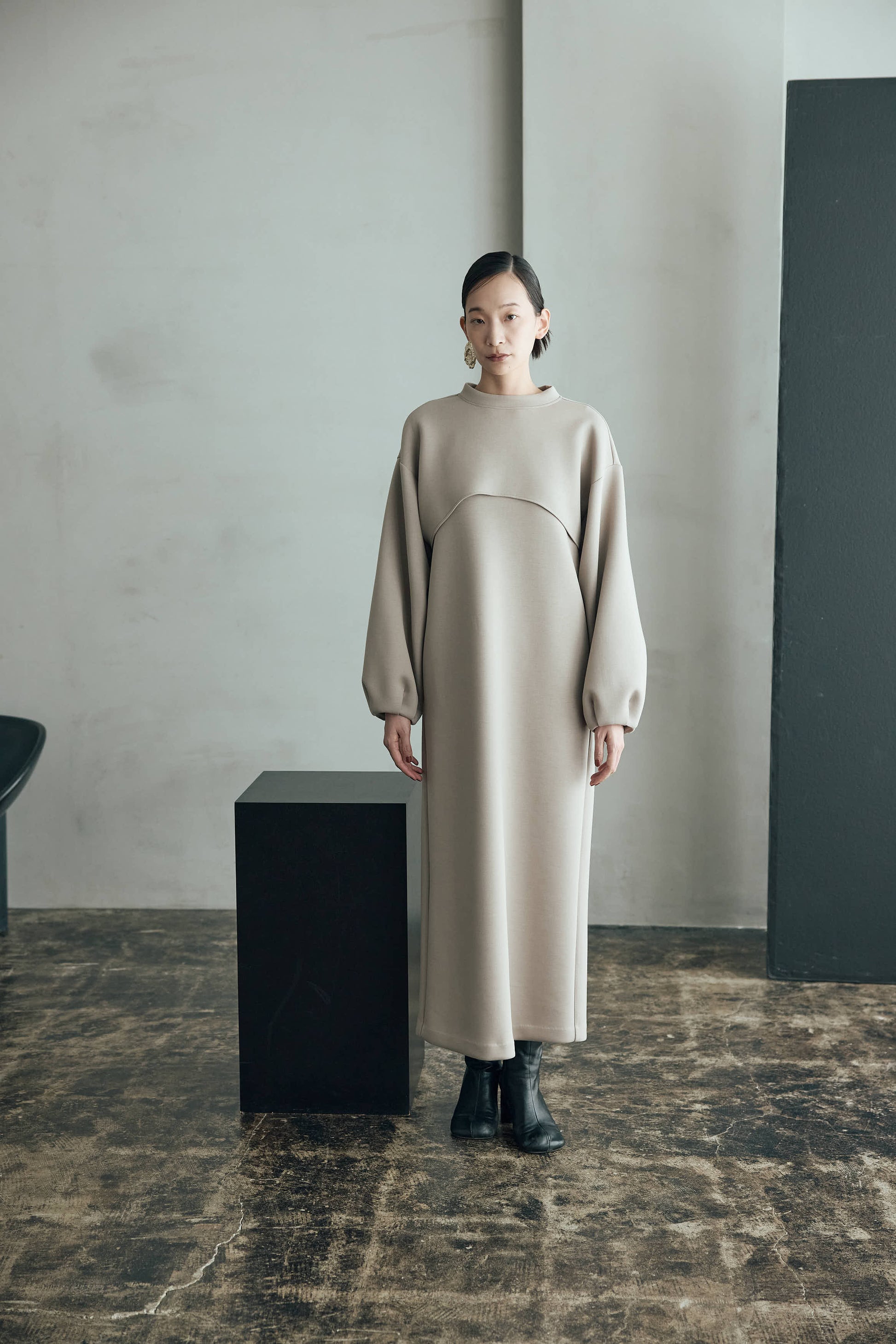 シンプルなワンピースに丸みのあるスリーブが印象的なプルオーバーを重ねることで奥行きのあるスタイリングを楽しめます。