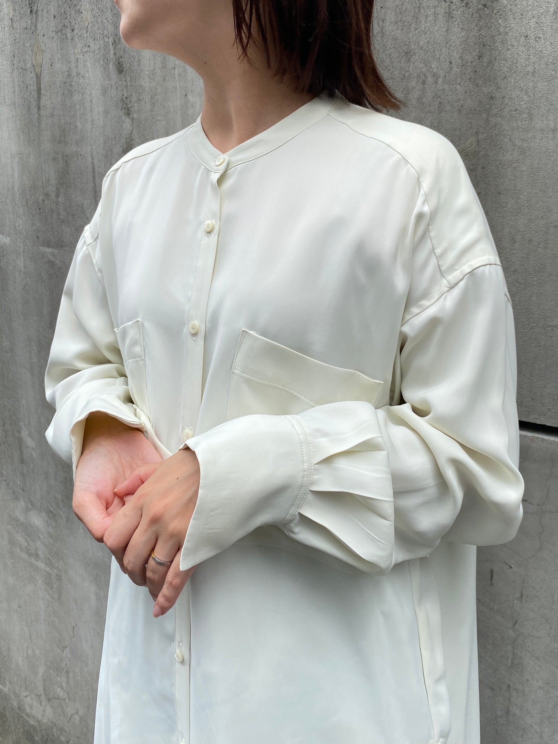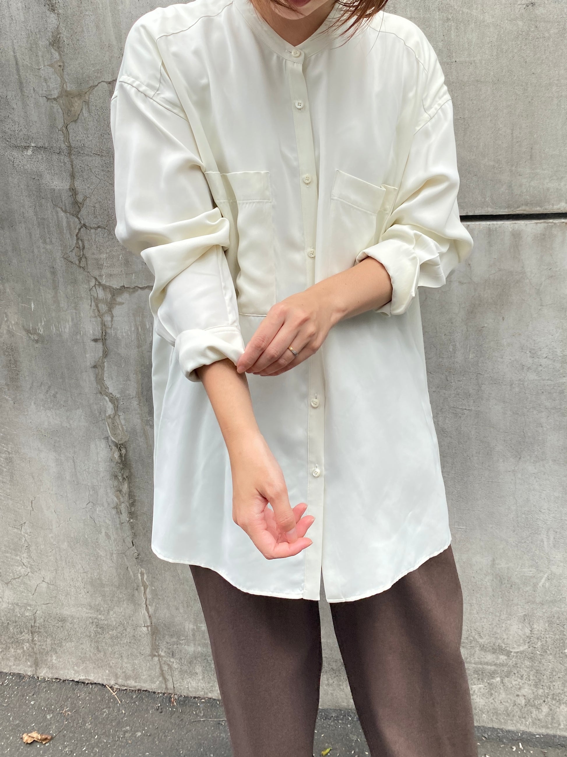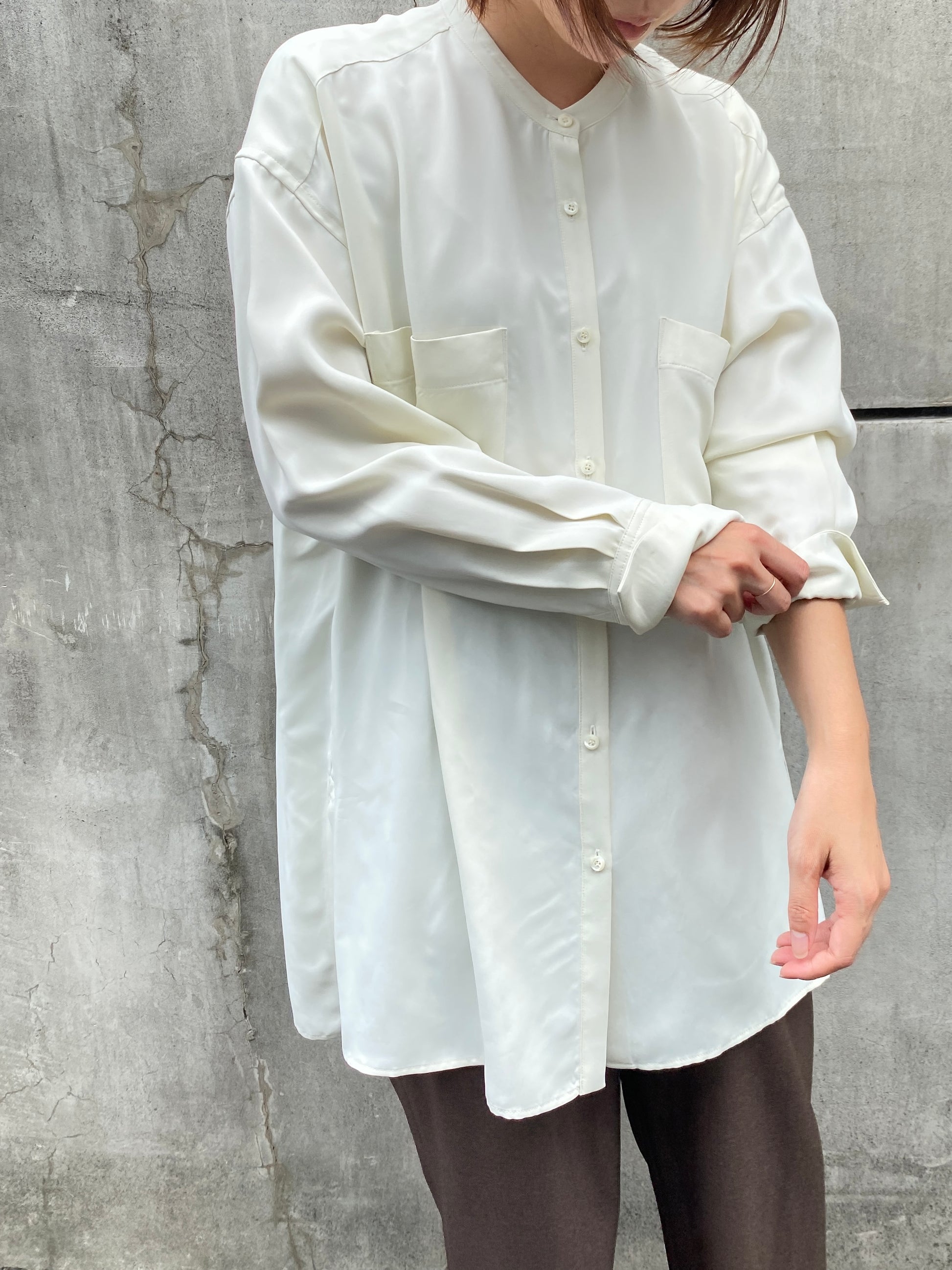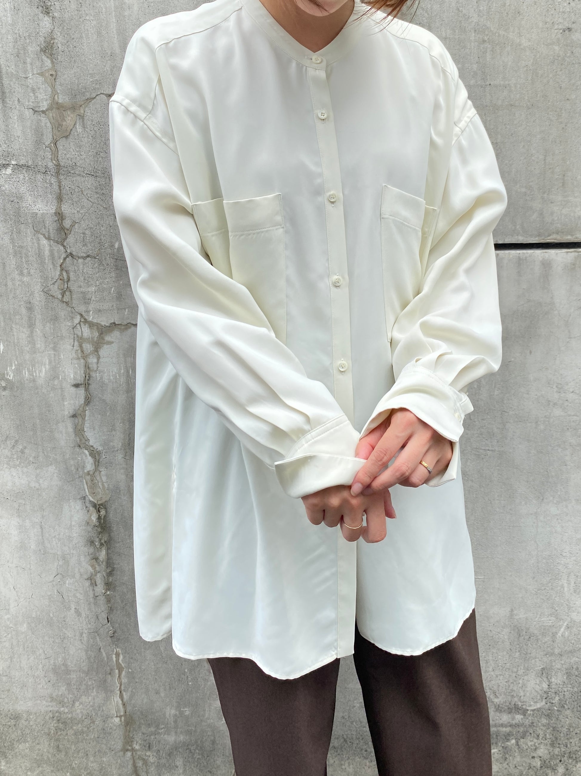 適度なヴィンテージ感が魅力の、マットなサテン素材を使用したノーカラーシャツ。