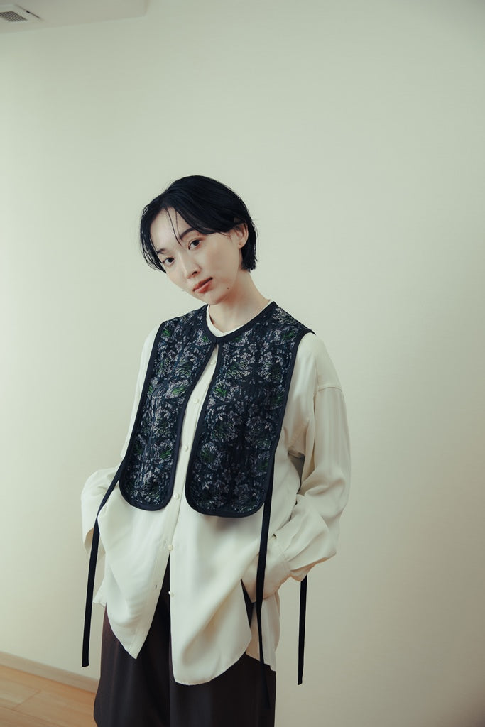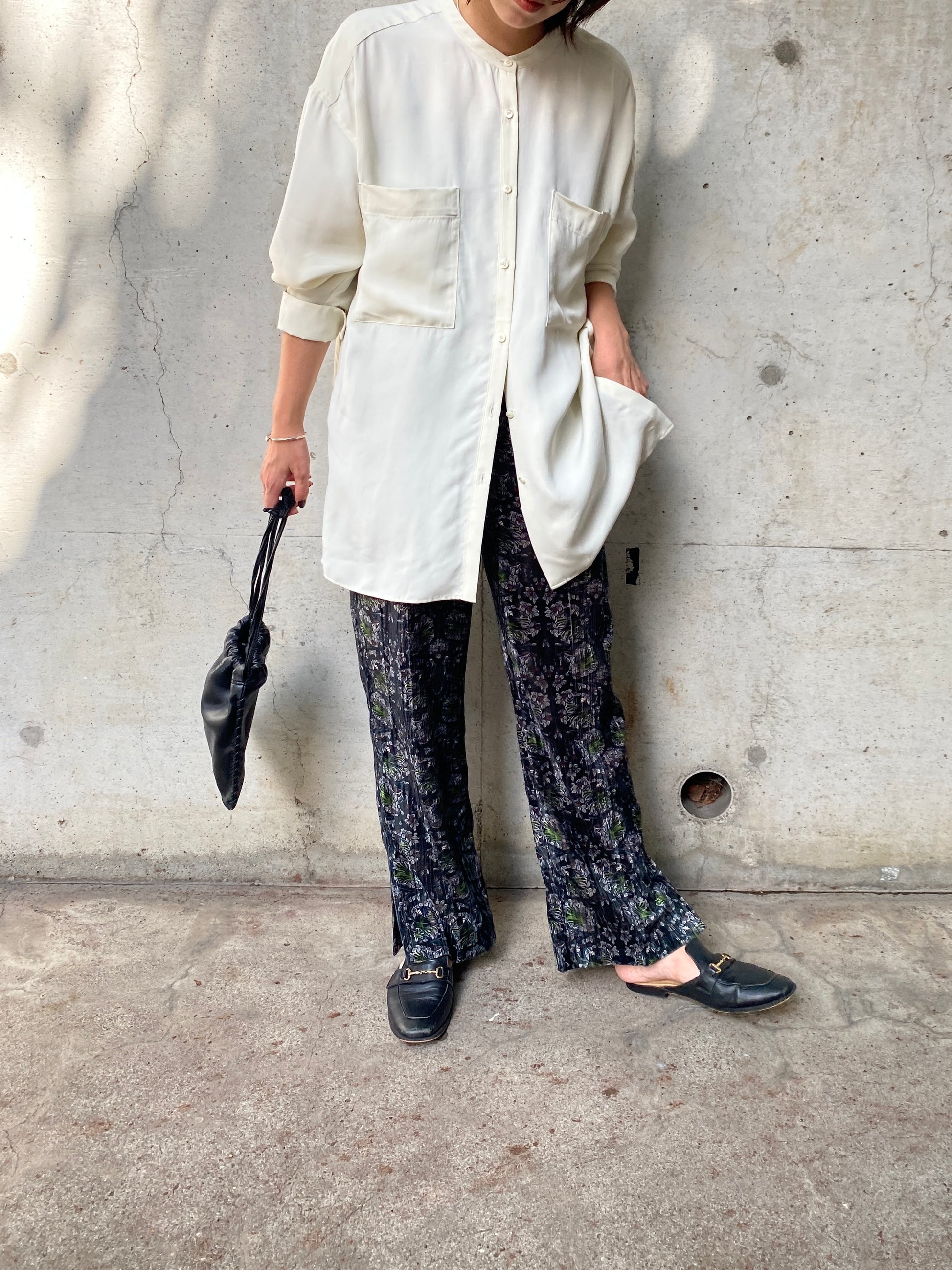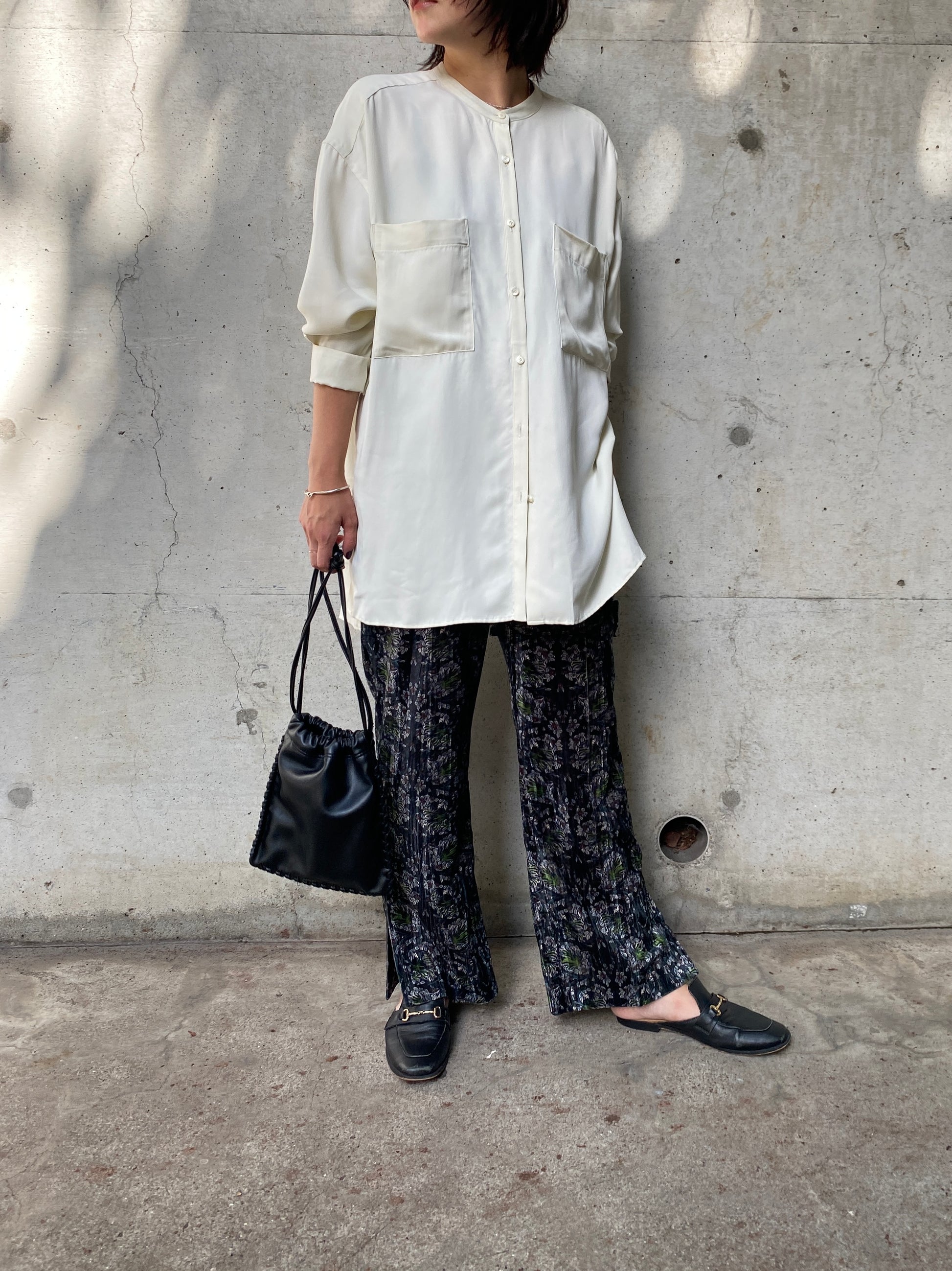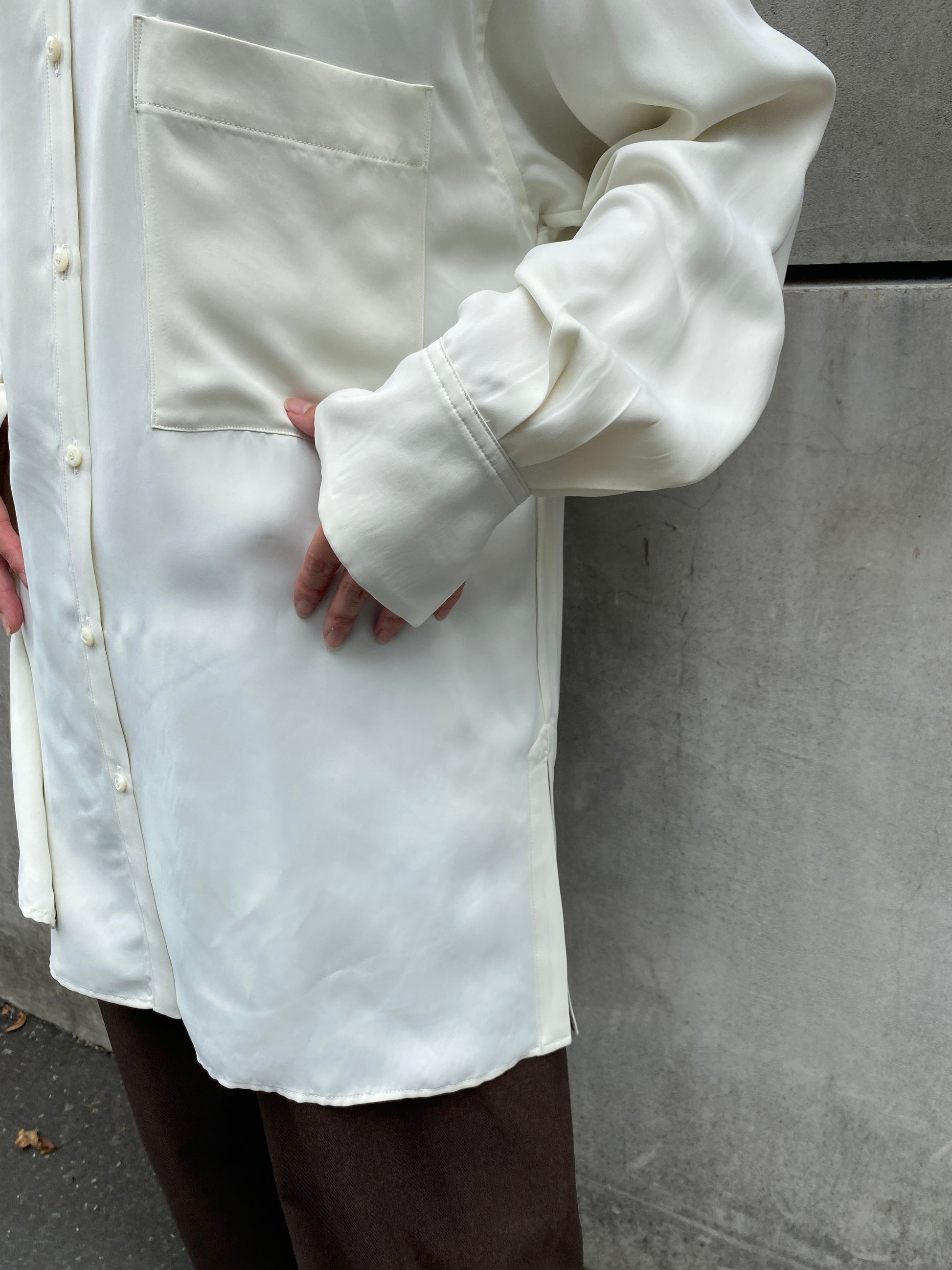 適度なヴィンテージ感が魅力の、マットなサテン素材を使用したノーカラーシャツ。