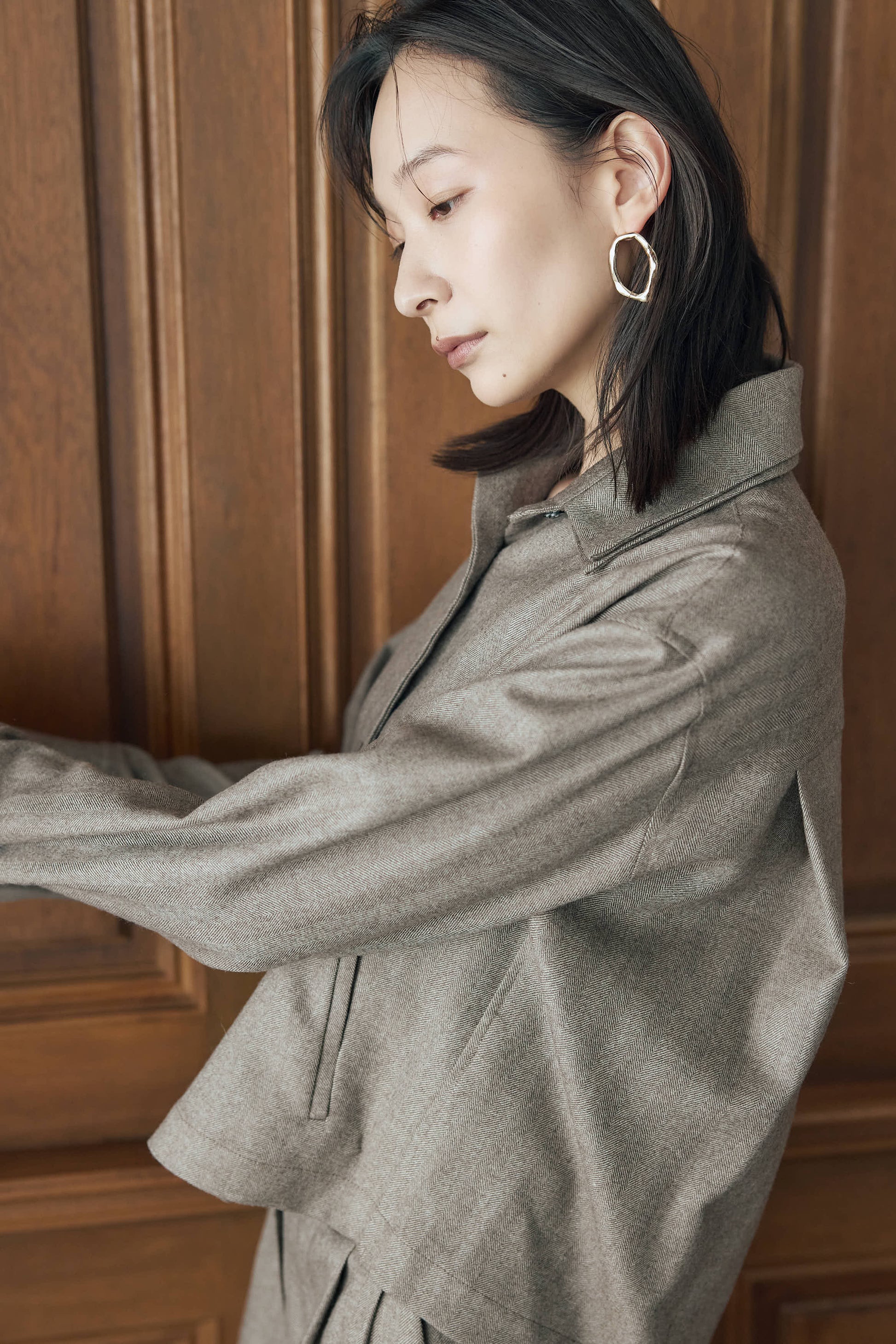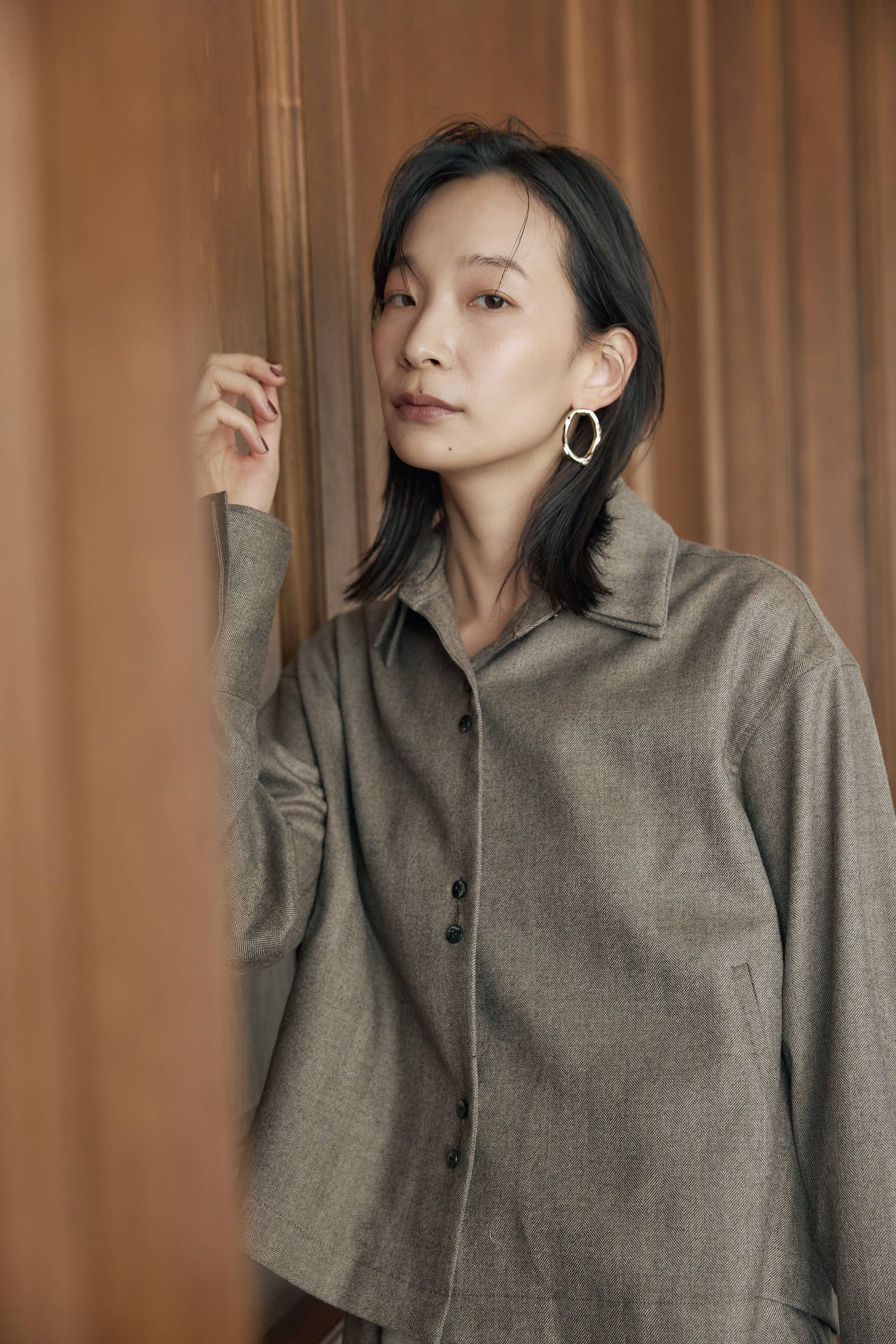 二重に重なった襟が顔まわりを印象的に見せ、フロントの2個付けボタンがさりげないデザインポイントに。