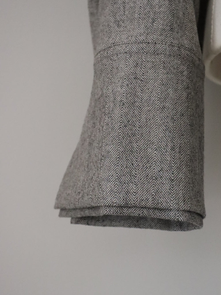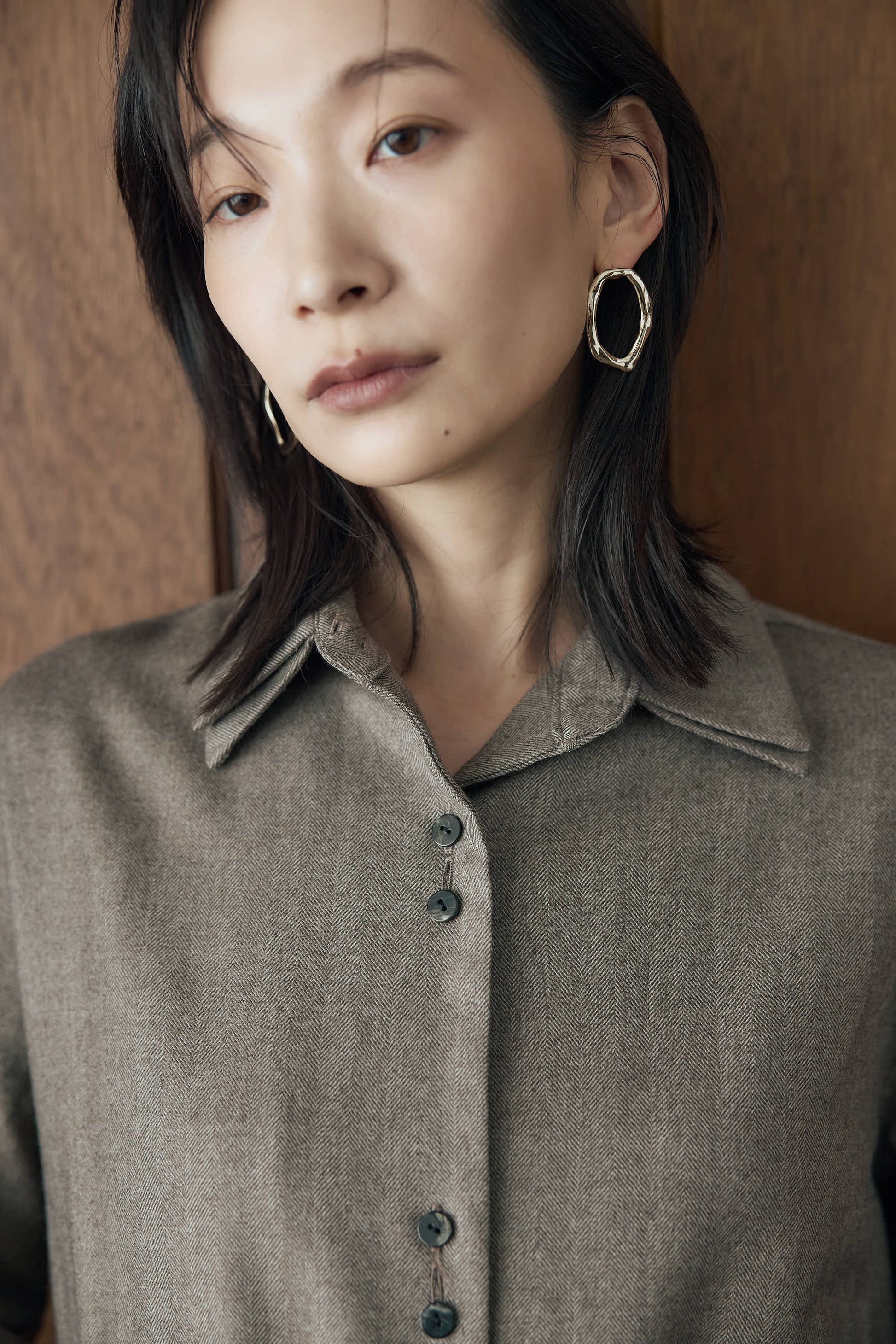 二重に重なった襟が顔まわりを印象的に見せ、フロントの2個付けボタンがさりげないデザインポイントに。