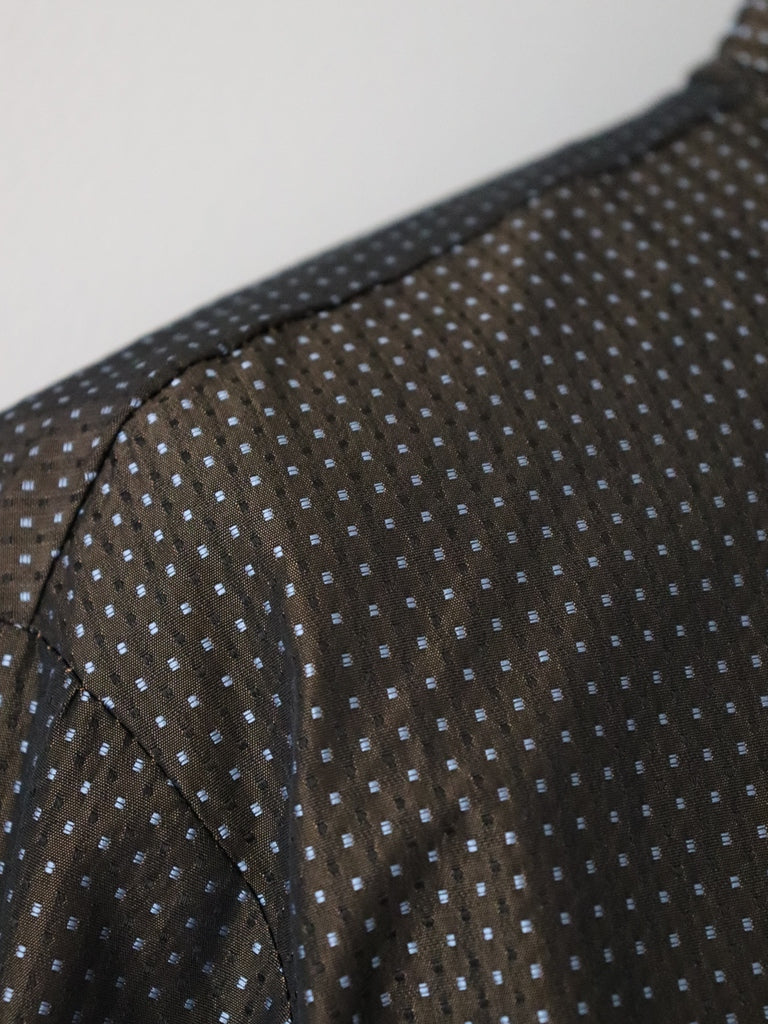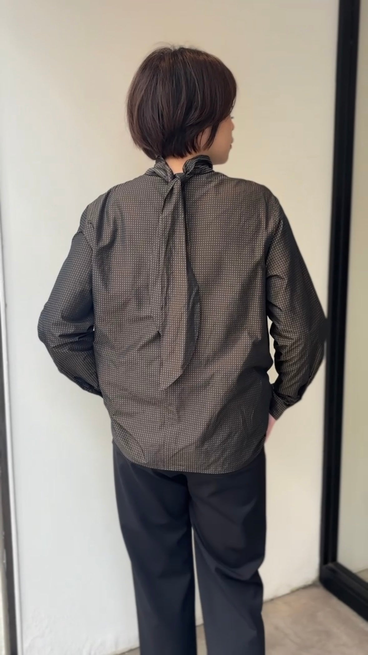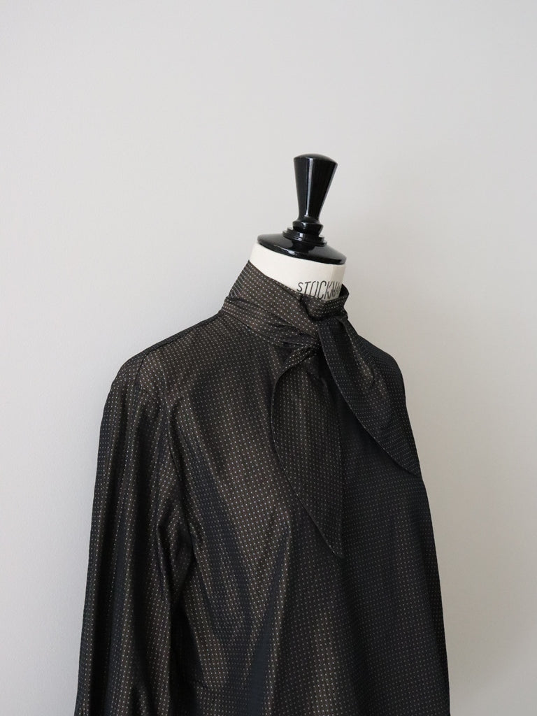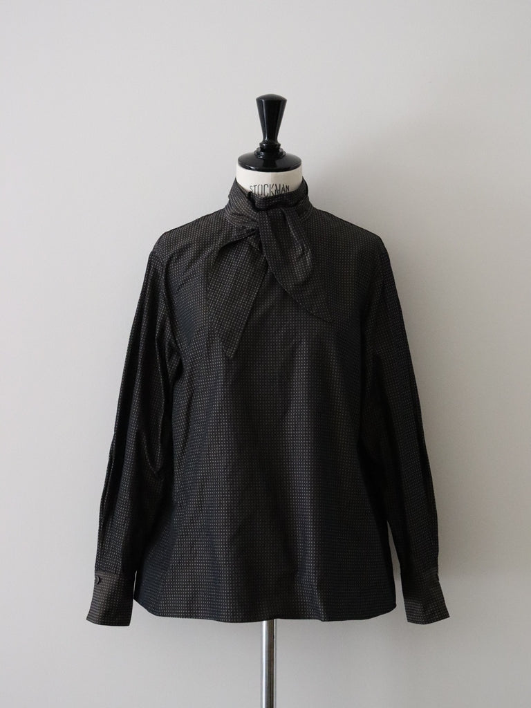 シワになりにくい、マットなポリエステルタフタベースに、リサイクルポリエステルを使い、刺子調に織られたドットボウタイブラウス