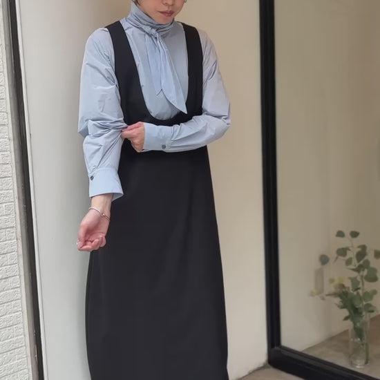 滑らかな手触りと上品な光沢のワンピースは高級感漂う印象に。