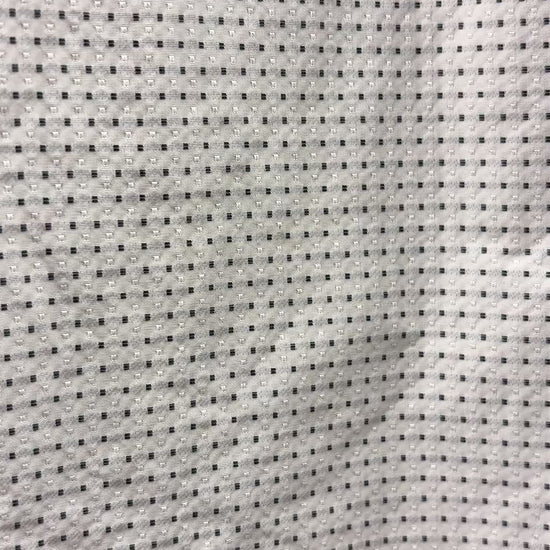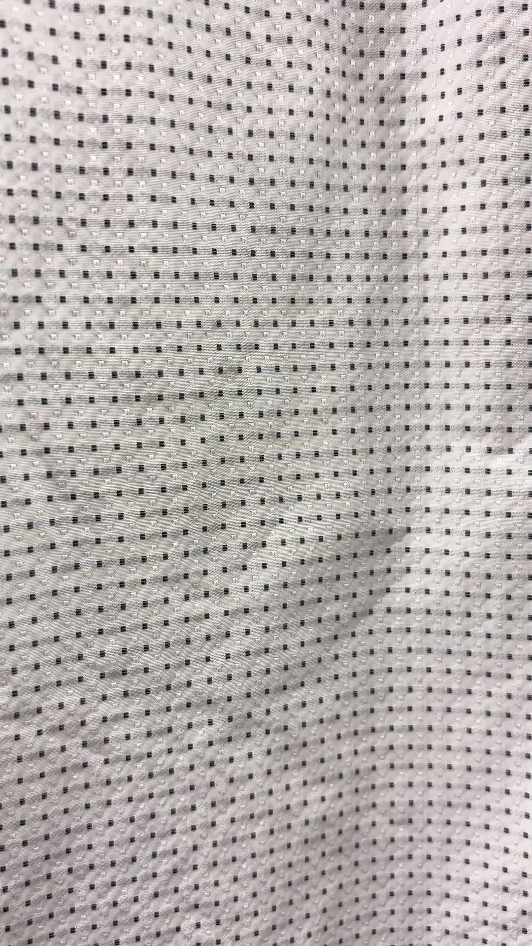 シワになりにくい、マットなポリエステルタフタベースに、リサイクルポリエステルを使い、刺子調に織られたドットボウタイブラウス