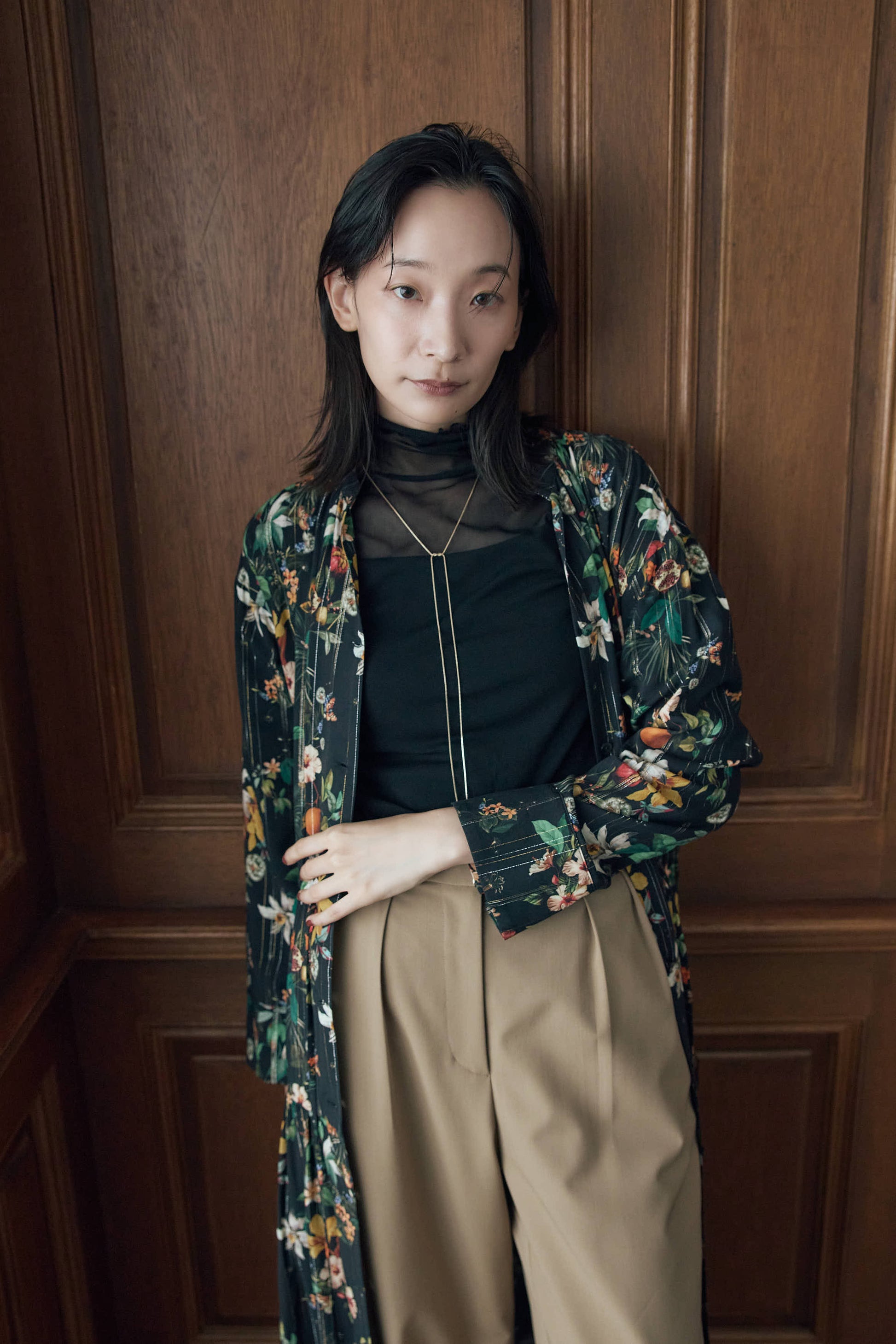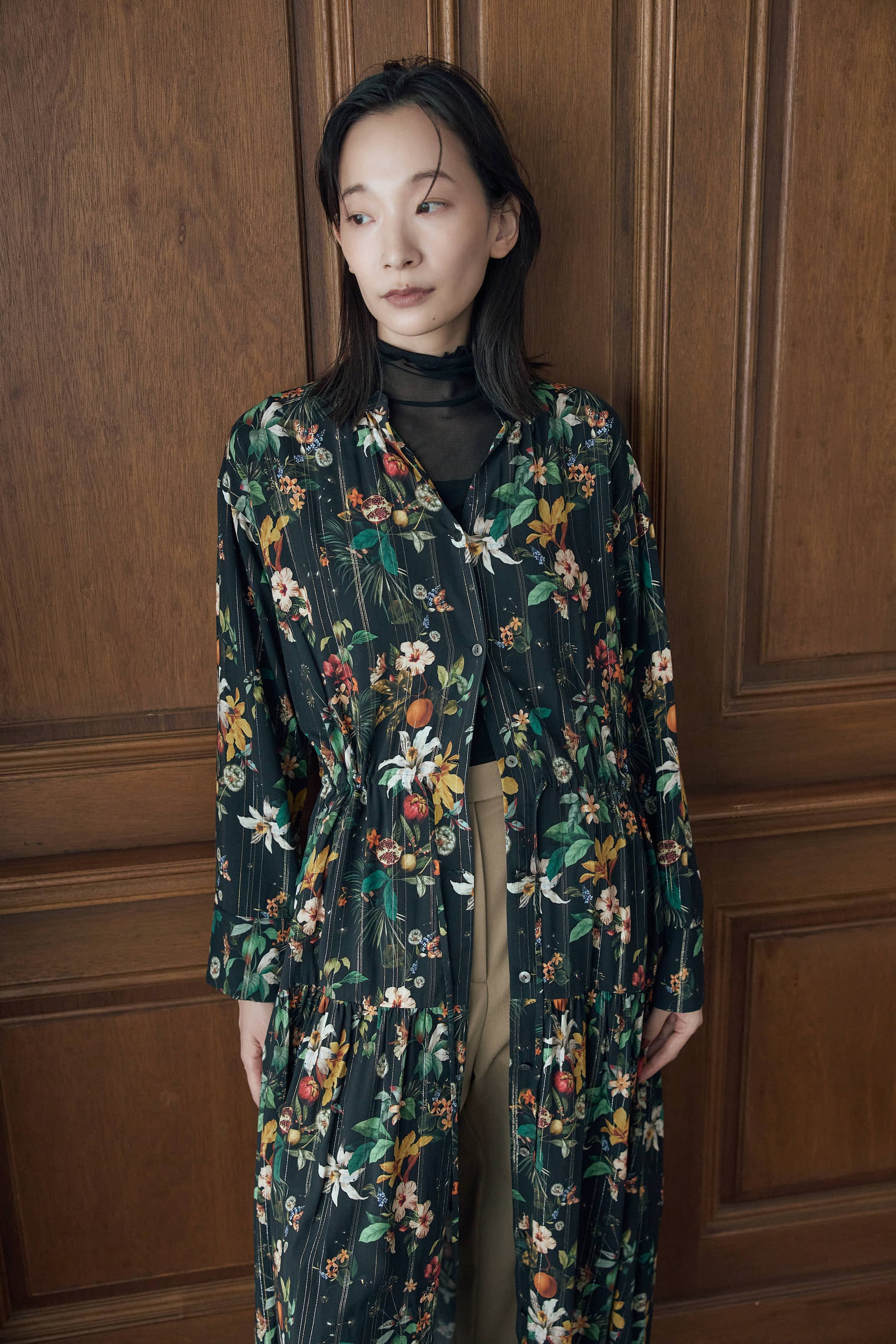 ボタンを全て閉じてワンピースとして着用するとグッと存在感のある1枚に。