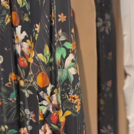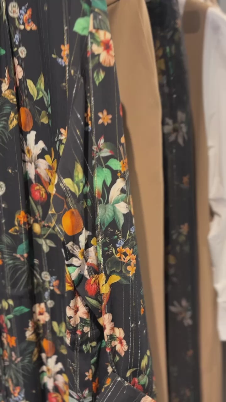 なめらかな落ち感のあるビスコースに、ラメ糸を織り込んだ上品な光沢感のある生地は、鮮やかなボタニカルフラワープリント。