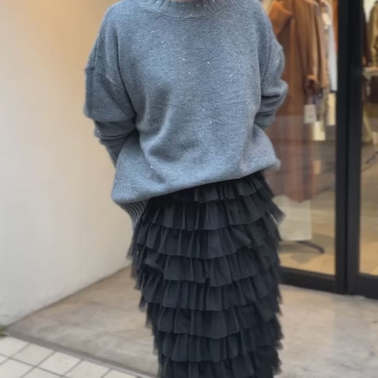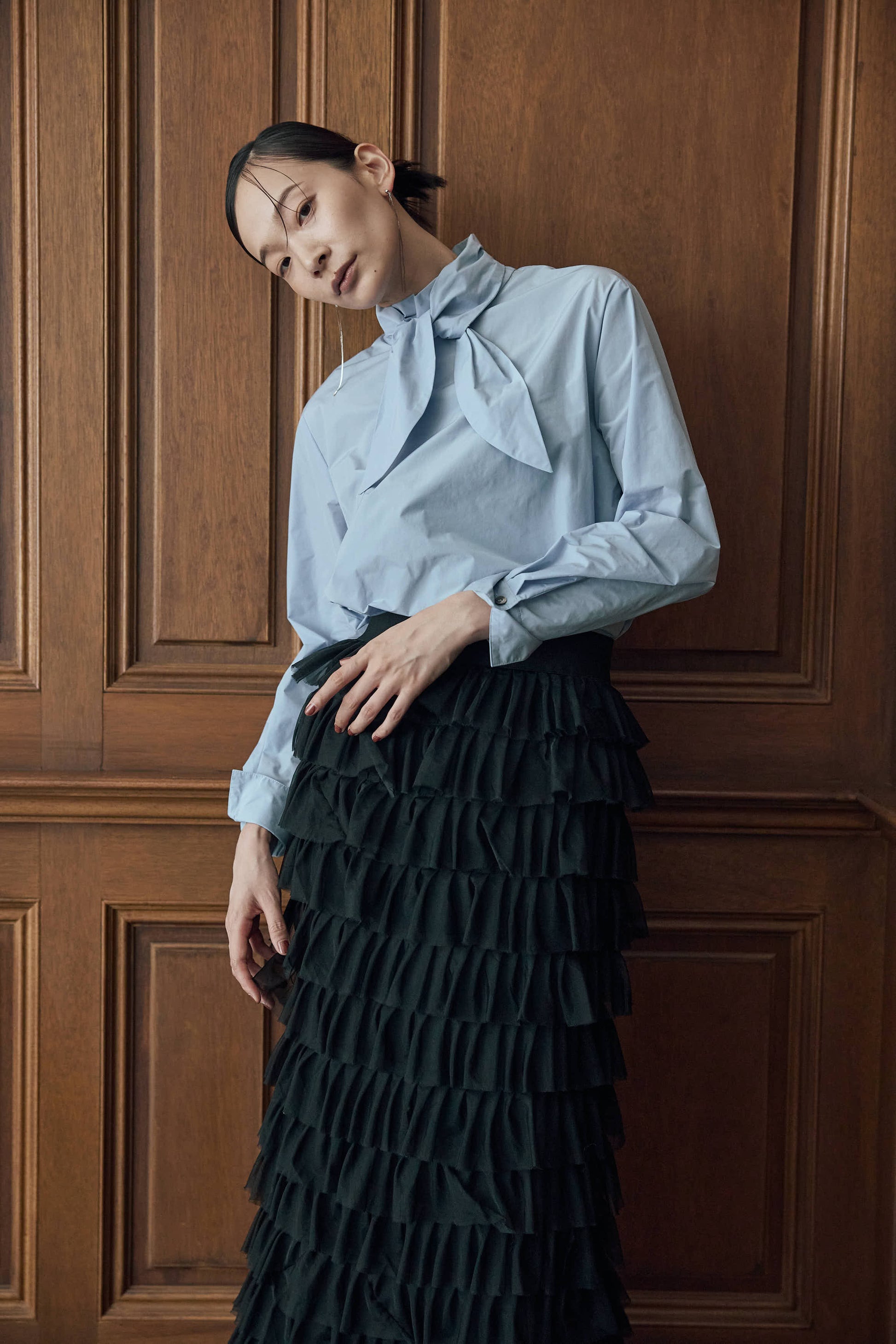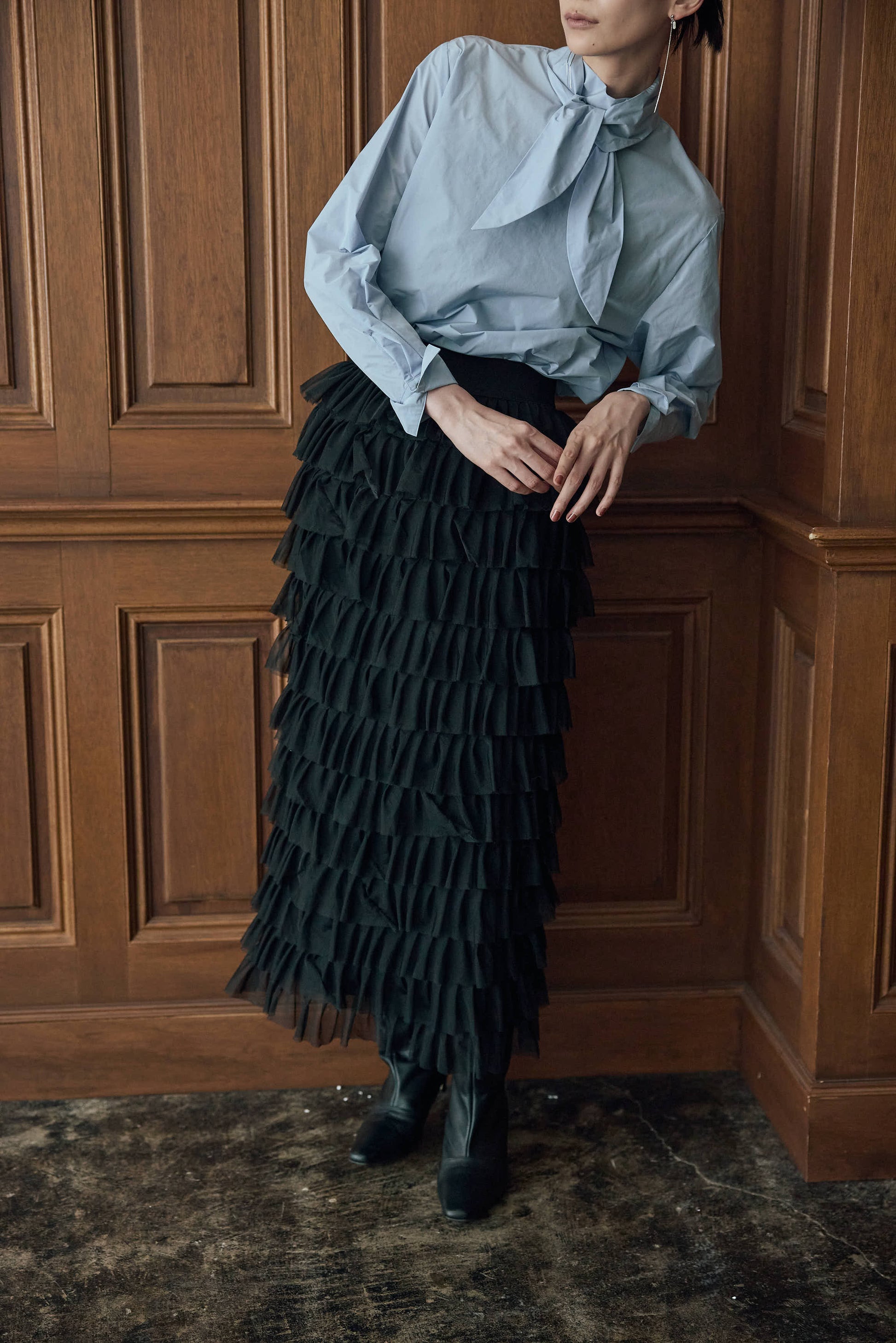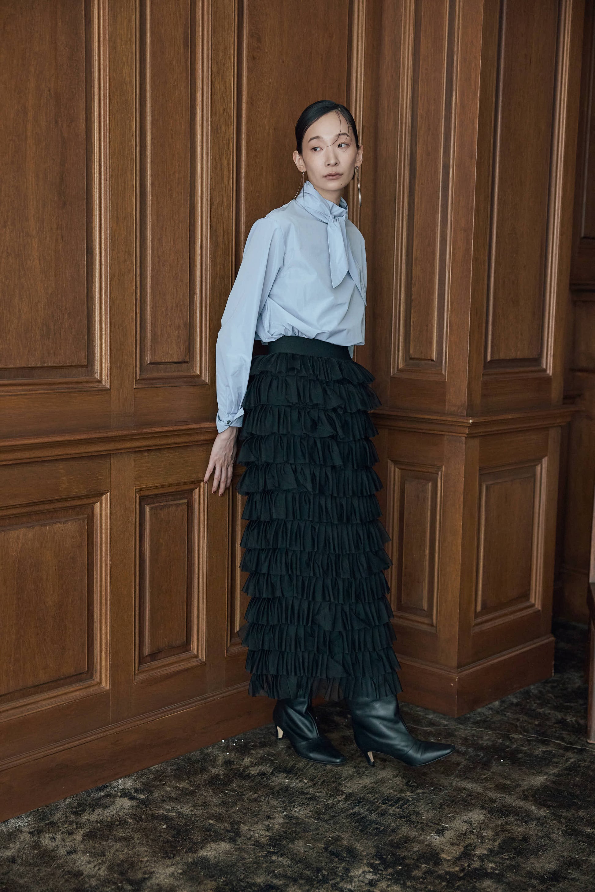 存在感のある、ティアードオーガンジータイトスカートは、がさっとした質感で甘すぎない印象に。