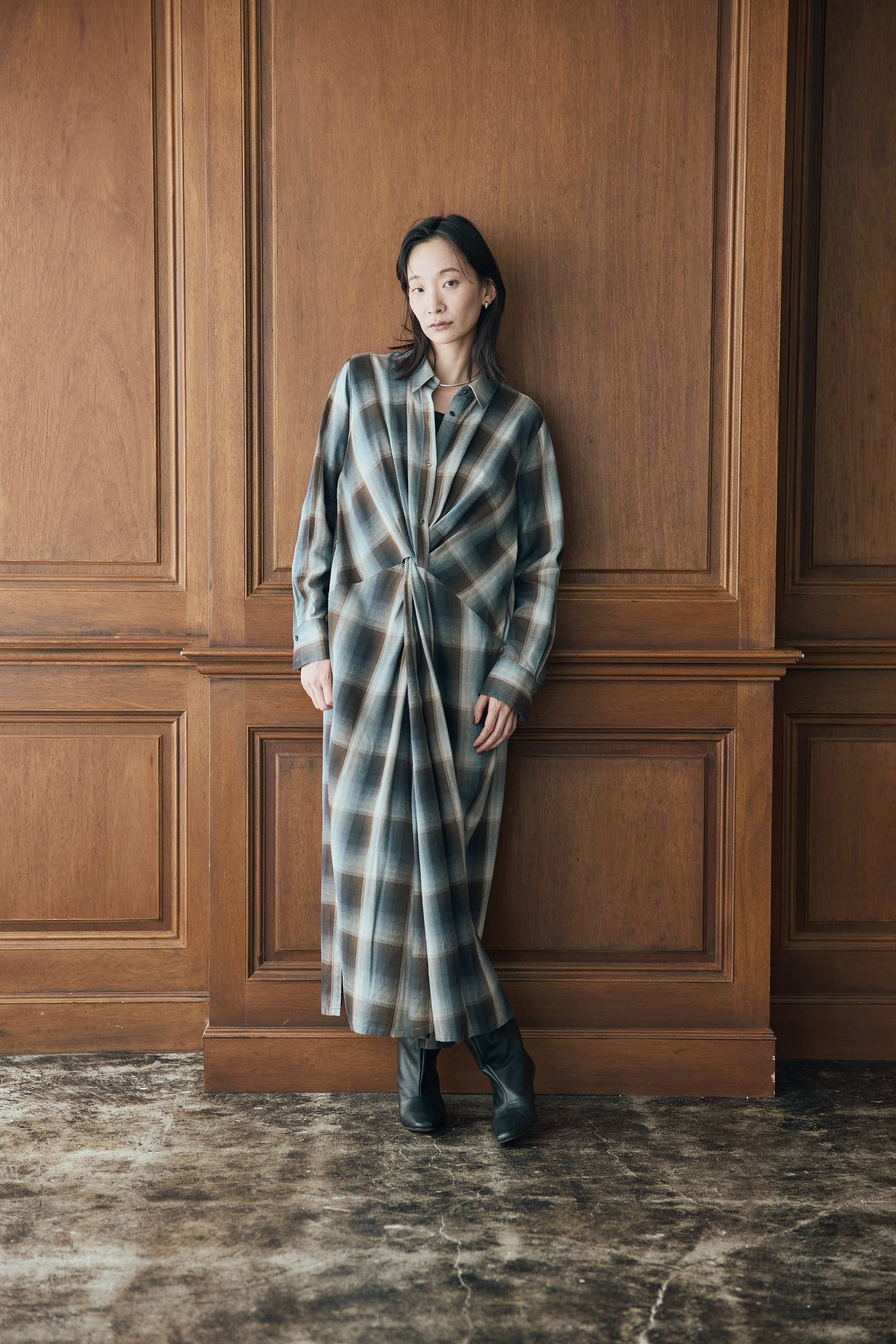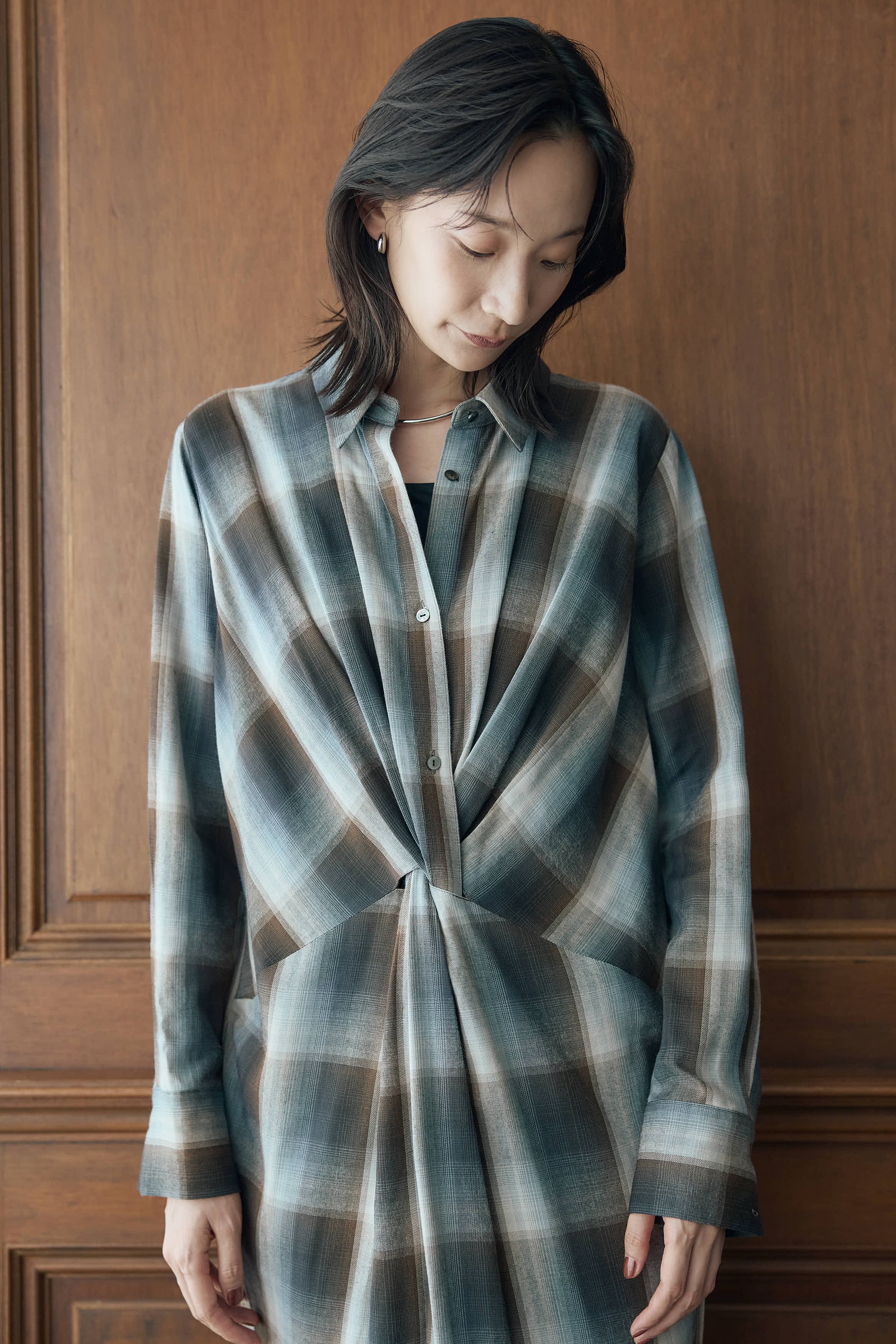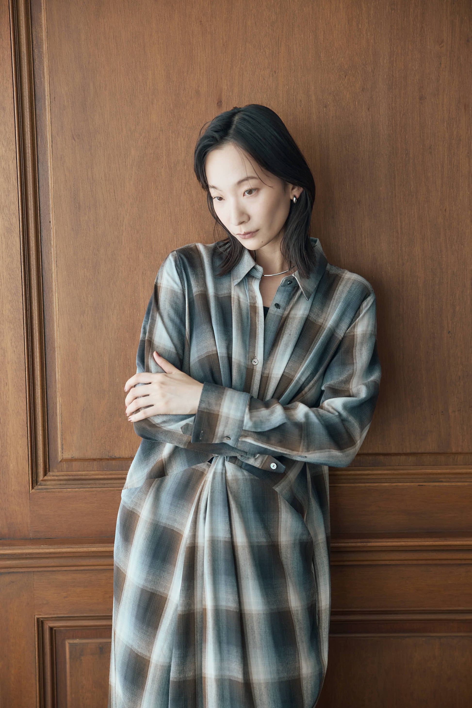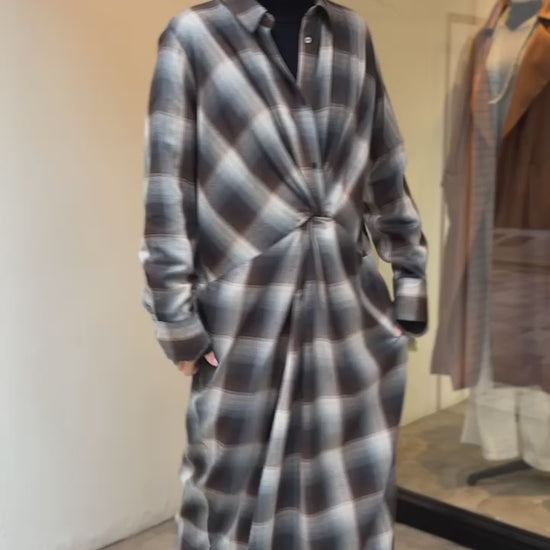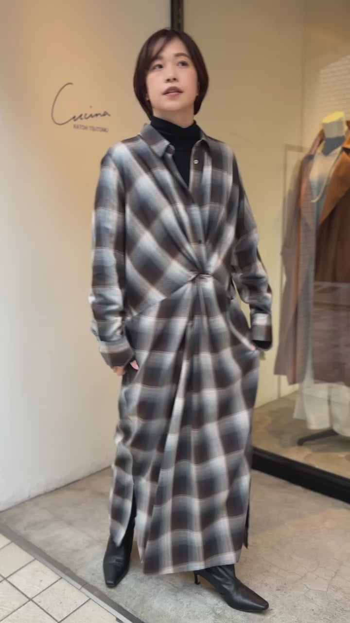 落ち感のあるニュアンスチェックで仕立てたシャツワンピース