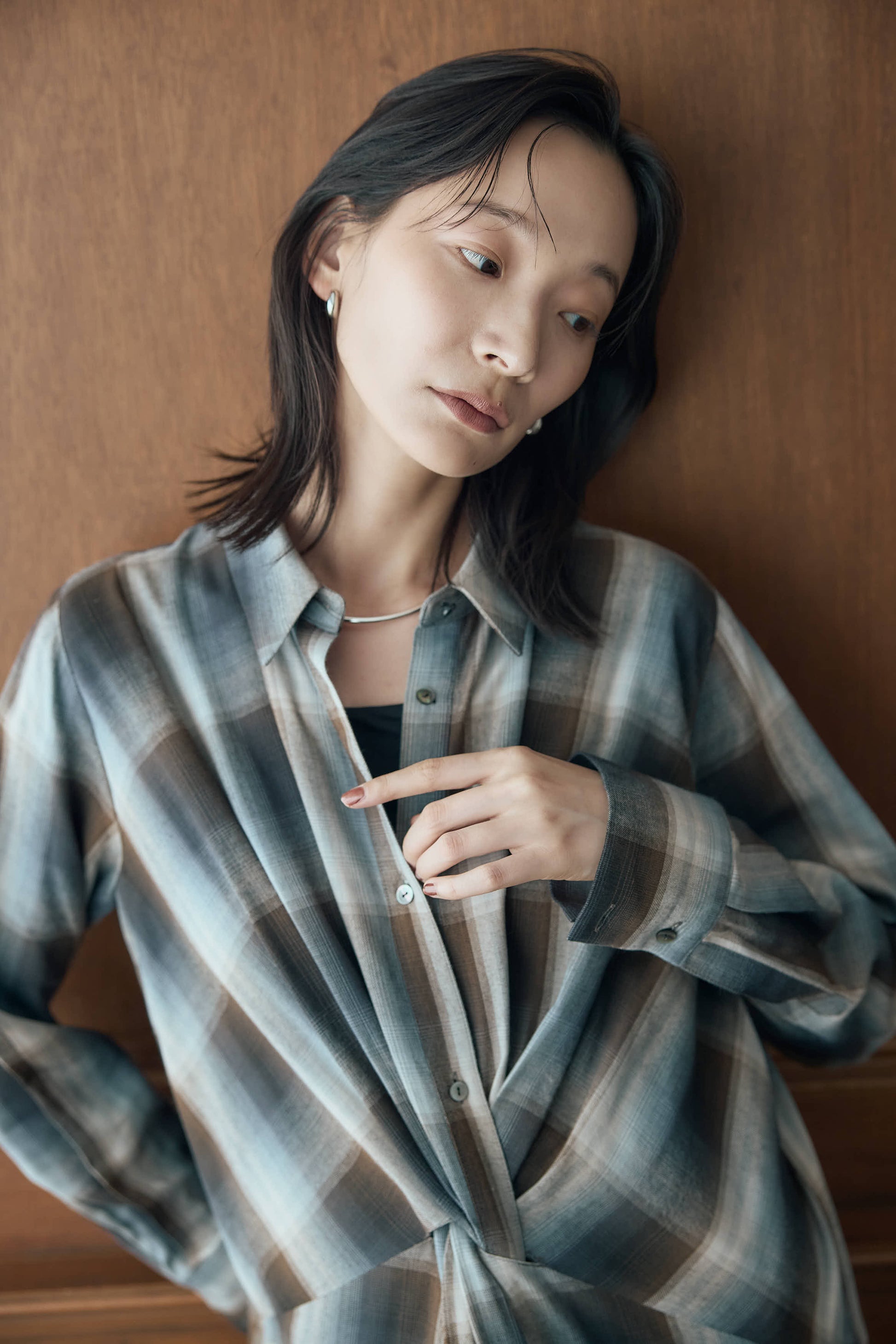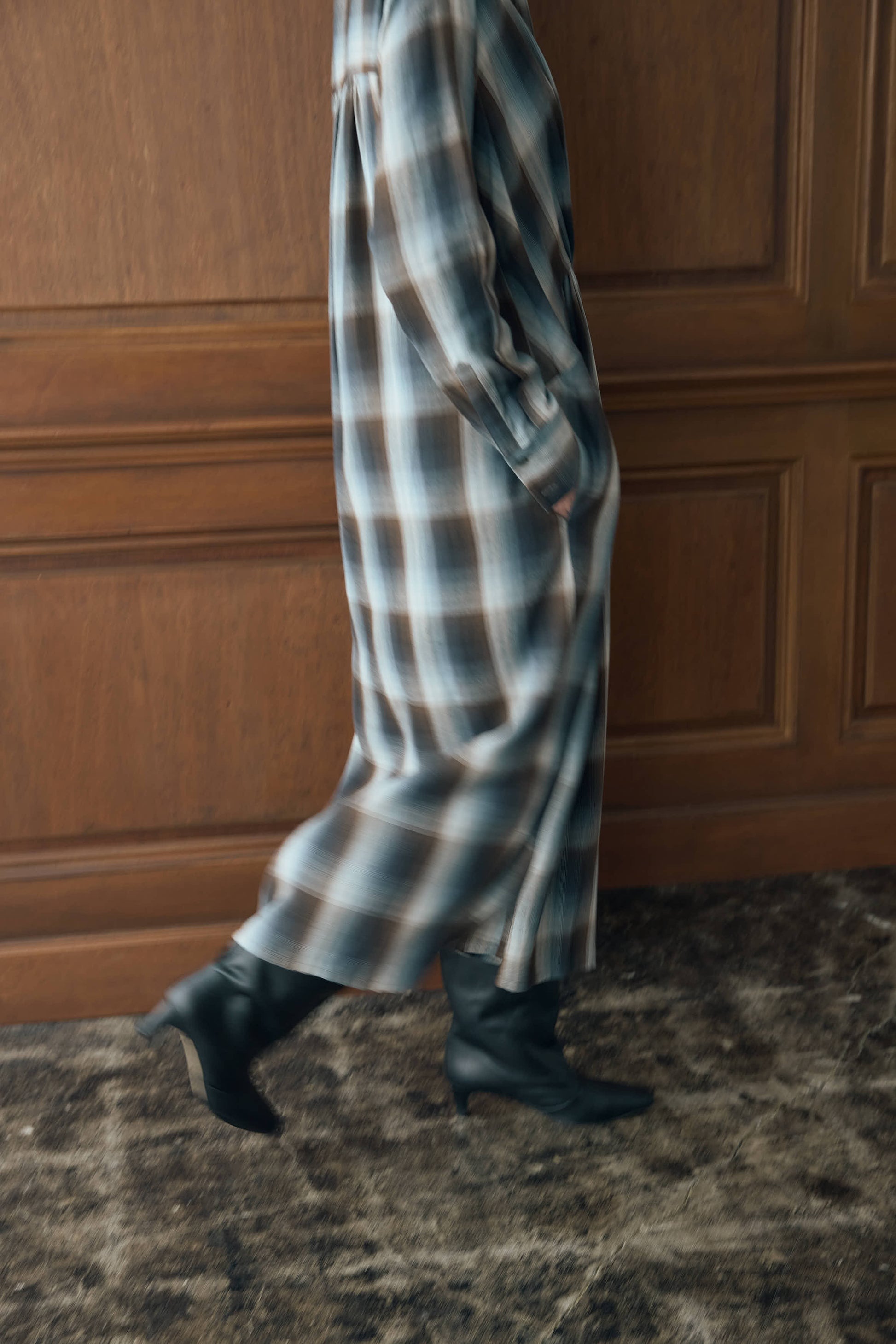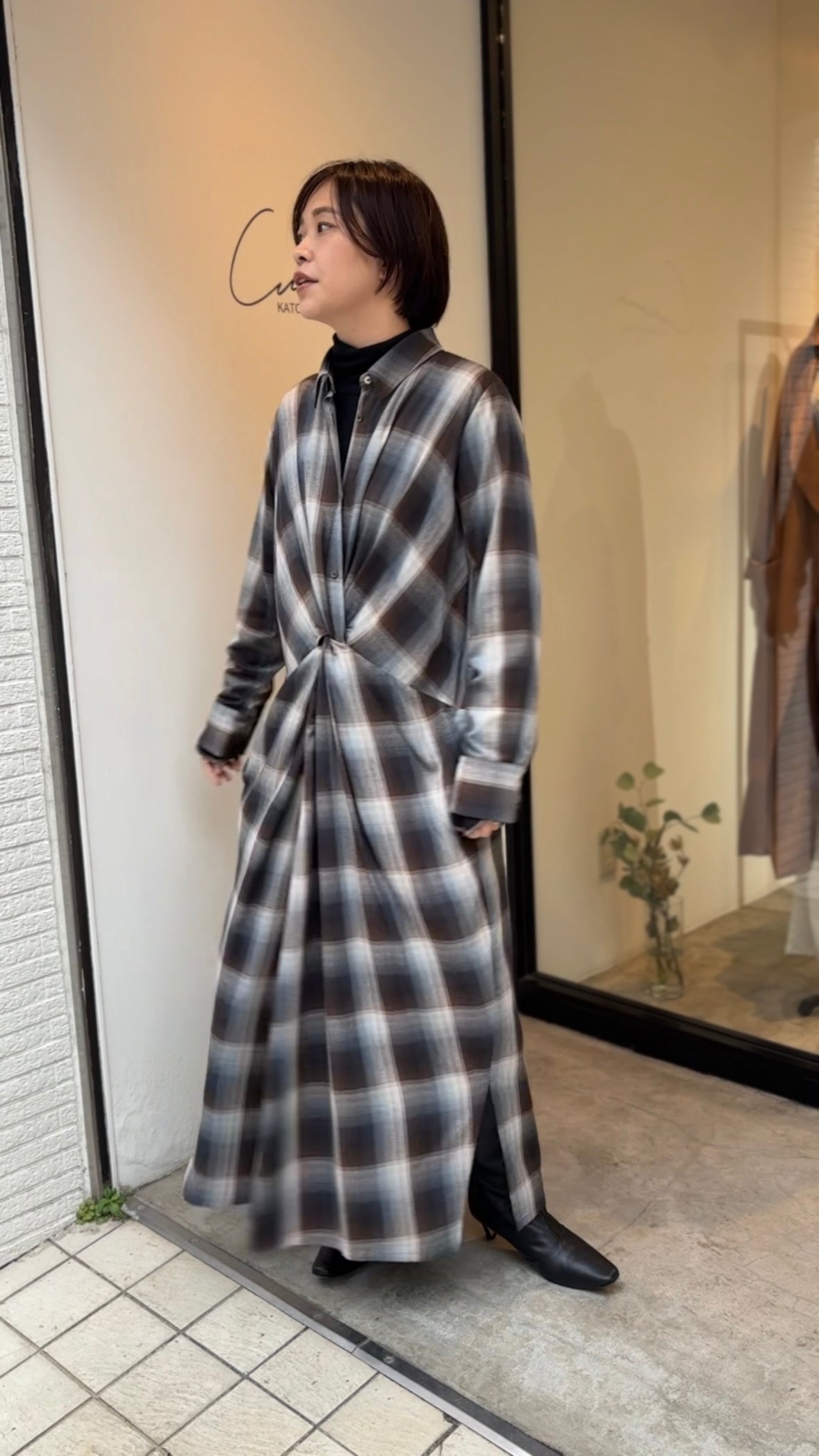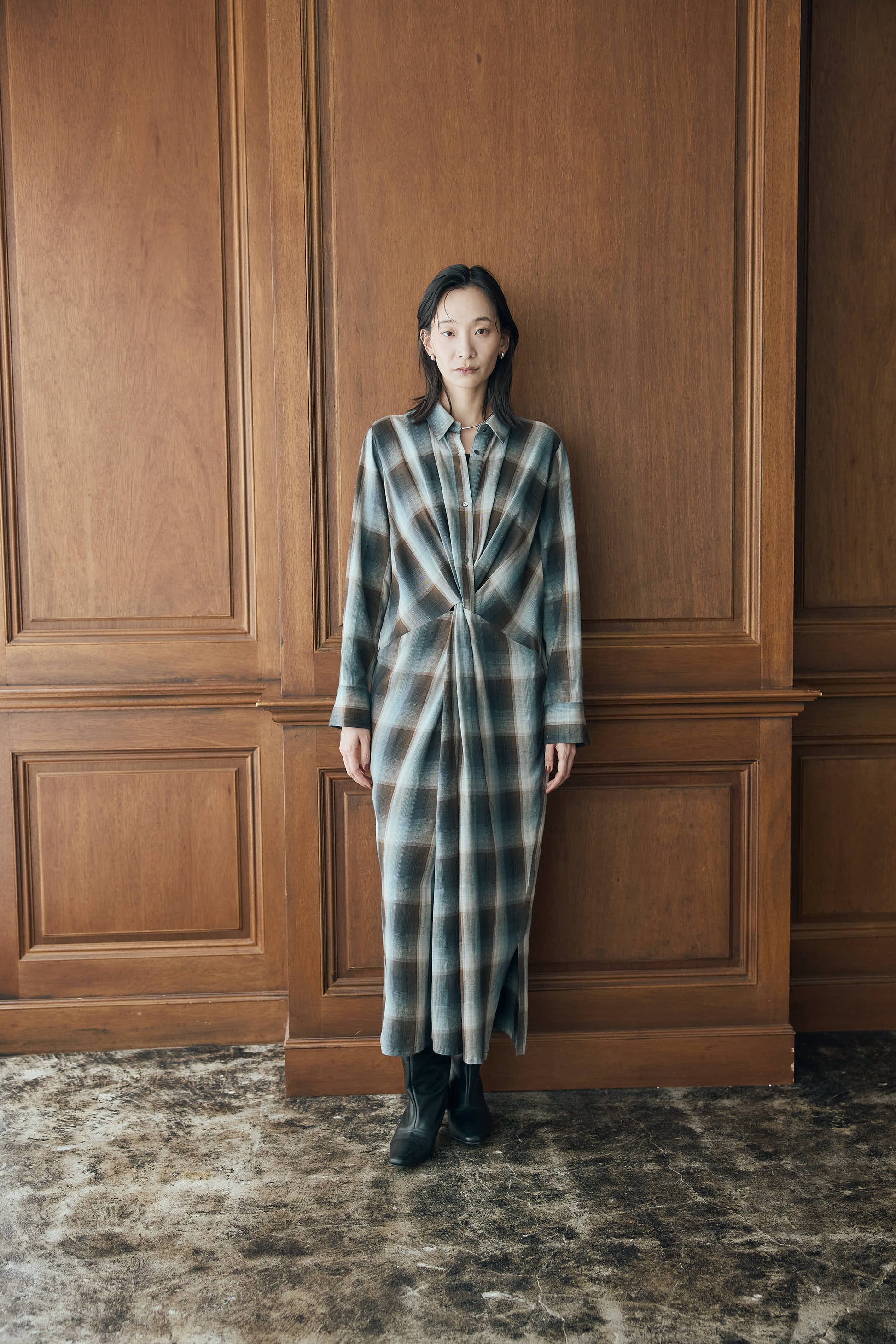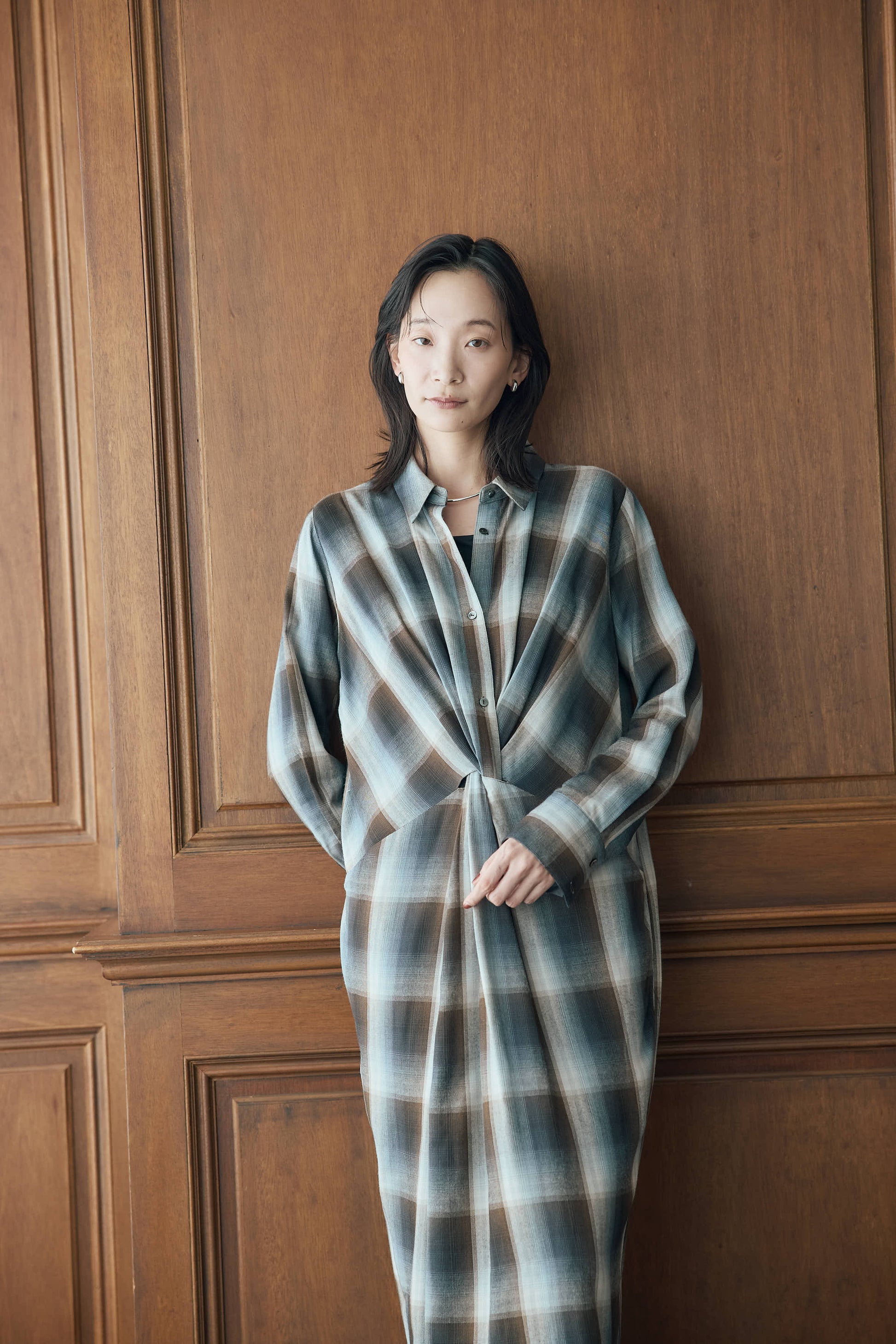 落ち感のあるニュアンスチェックで仕立てたシャツワンピース