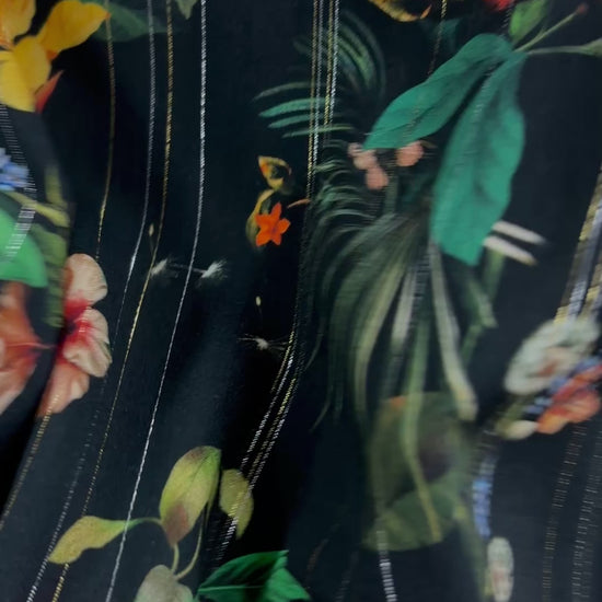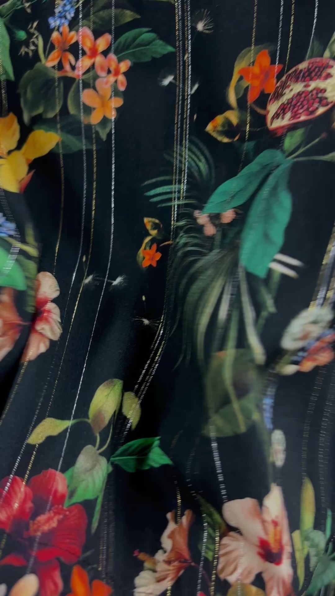 なめらかな落ち感のあるビスコースに、ラメ糸を織り込んだ上品な光沢感のある生地は、鮮やかなボタニカルフラワープリント。